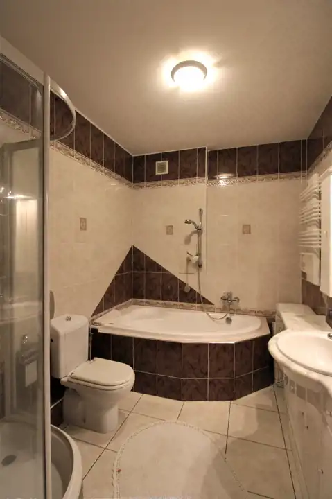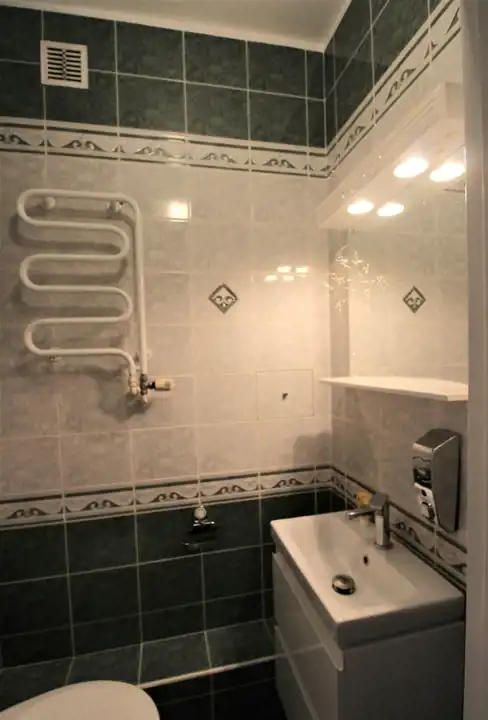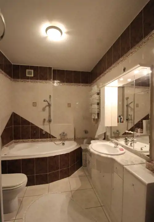 - komfortowej łazienki z kabiną prysznicową, wanną, umywalką, lustrem, zabudową meblową i toaletą,