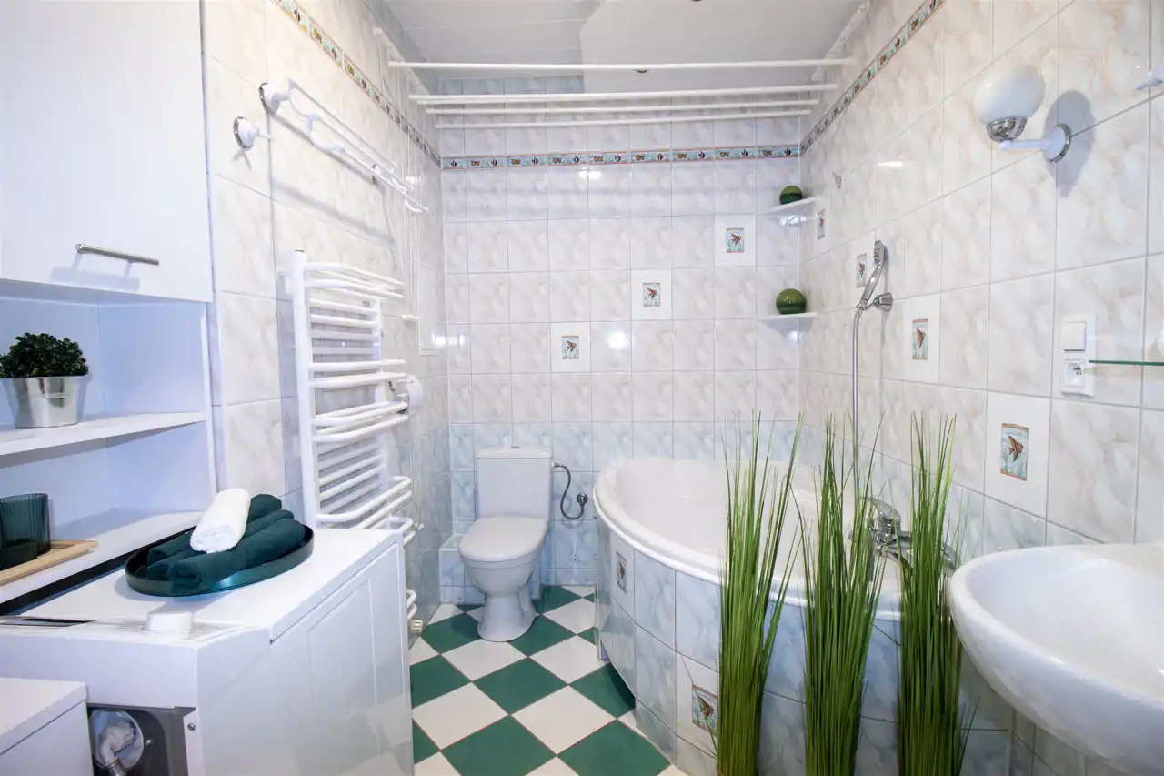 Łazienka: pralka, meble łazienkowe, wanna, umywalka, toaleta, suszarka.
