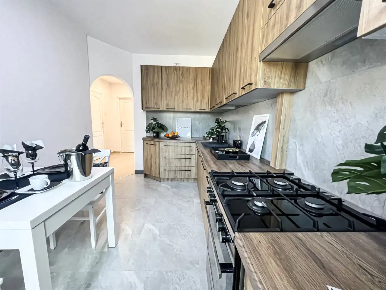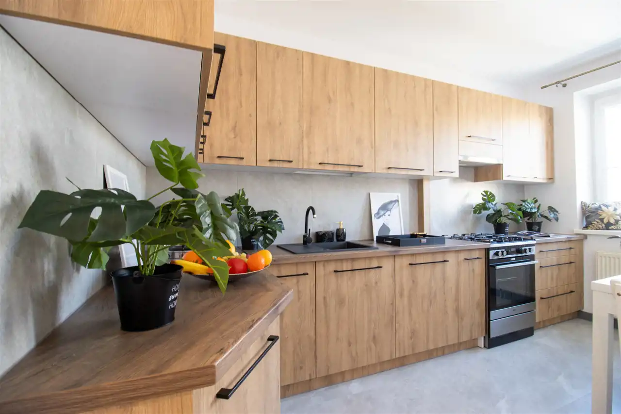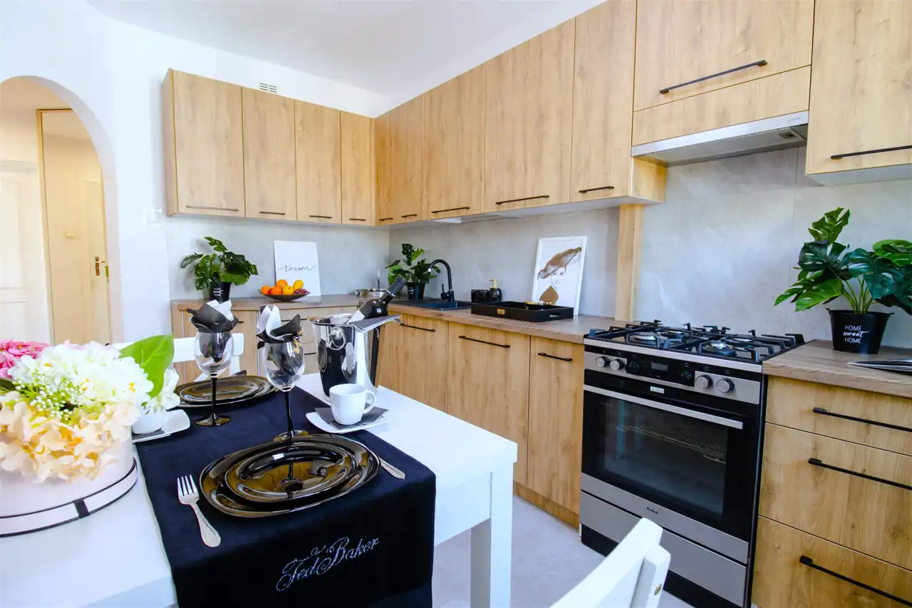 Kuchnia: nowe meble w zabudowie, stół, dwa krzesła, lodówko-zamrażarka, zmywarka, piekarnik, płyta gazowa, okap, umywalka.