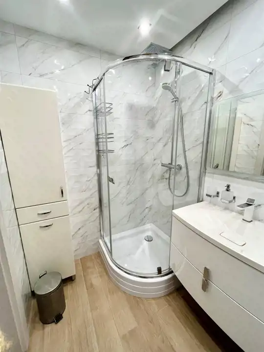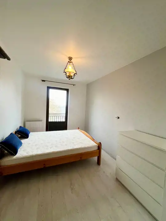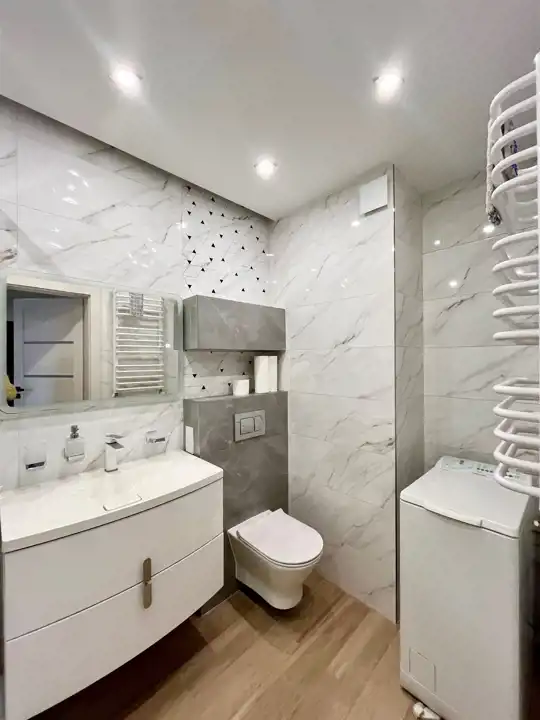 - Łazienka: Nowoczesna z prysznicem, WC oraz pralką.