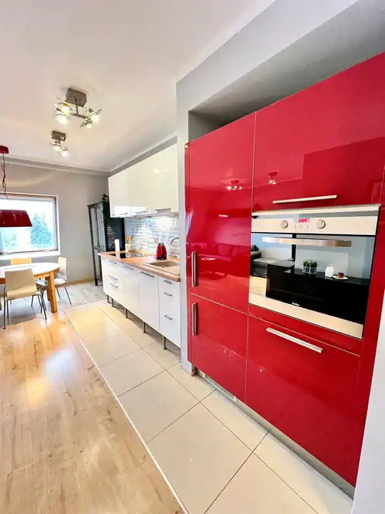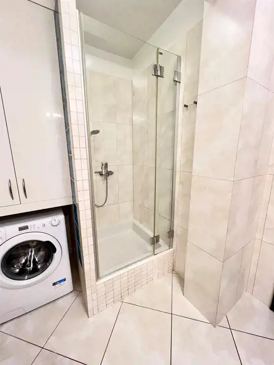 - Łazienka: Nowoczesna i estetyczna, wyposażona w kabinę prysznicową, pralkę w zabudowie oraz funkcjonalne szafki do przechowywania.