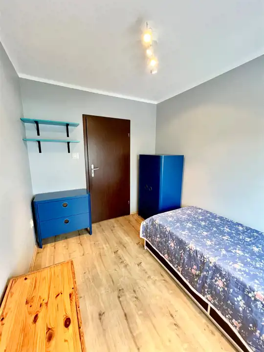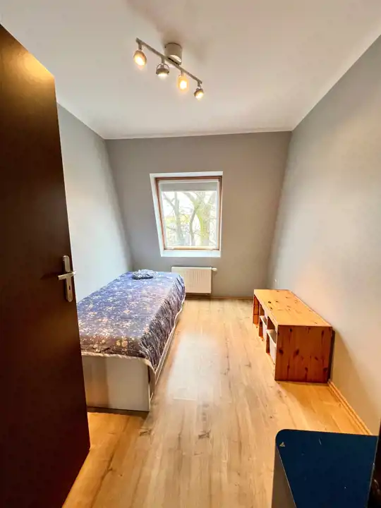 - Drugi pokój: Przytulny pokój z pojedynczym łóżkiem i szafą, który doskonale sprawdzi się jako pokój dziecięcy lub gabinet.