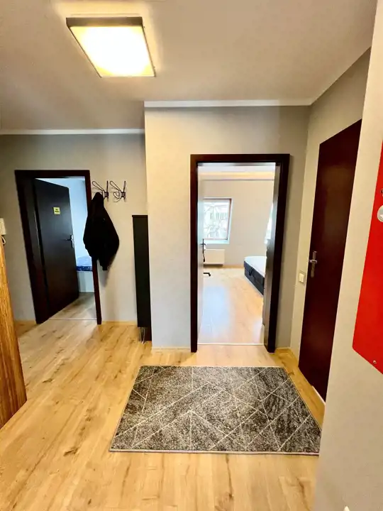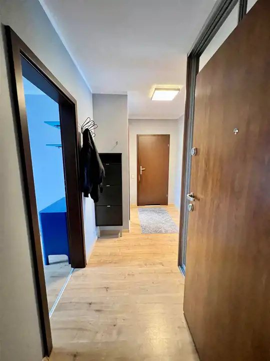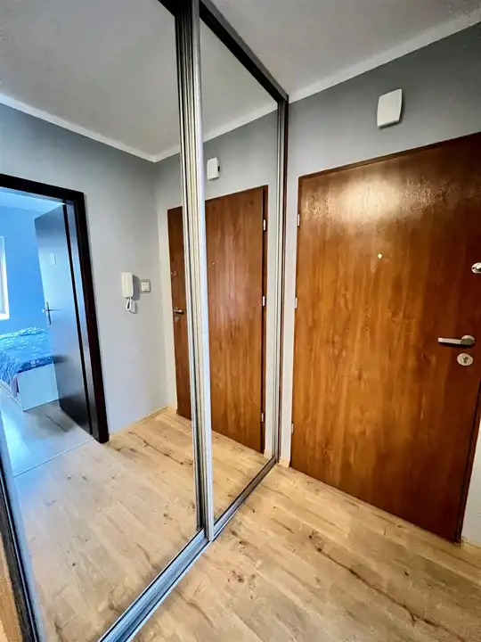 - Przedpokój: Funkcjonalny, z dużą szafą wnękową z lustrami, która optycznie powiększa przestrzeń.
