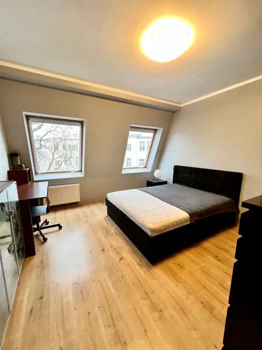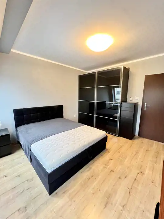 - Sypialnia główna: Wyposażona w duże dwuosobowe łóżko, pojemną szafę z lustrzanymi frontami oraz biurko do pracy.