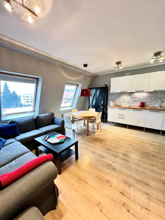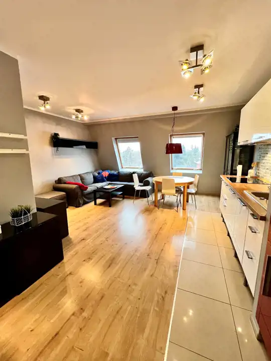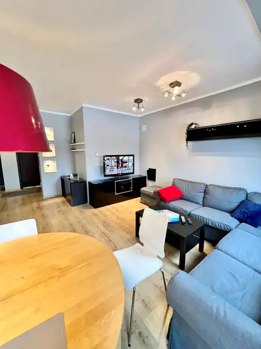 - Salon z częścią jadalną: Przestronna strefa dzienna z dużą, wygodną kanapą narożną, stolikiem kawowym oraz stołem jadalnianym – idealne miejsce do wypoczynku i wspólnych posiłków.