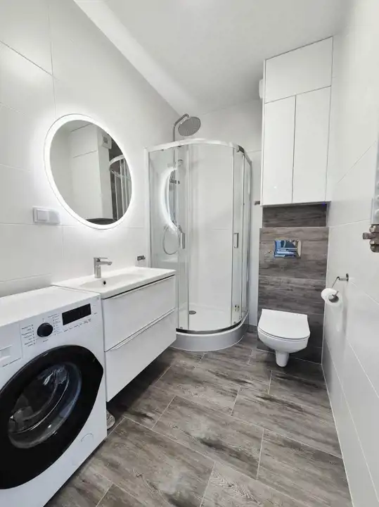 Mieszkanie świeżo oddane, wykończone przy użyciu materiałów wysokiej klasy. Umeblowane i wyposażone. Salon z wyjściem na duży balkon. Zabudowa kuchenna z AGD. W łazience kabina prysznicowa, pralka, kompakt WC, umywalka, zestaw mebli łazienkowych. W przedpokoju duża szafa w zabudowie. Drzwi antywłamaniowe. Okna PCV. Mieszkanie usytuowane jest na osiedlu zamkniętym.