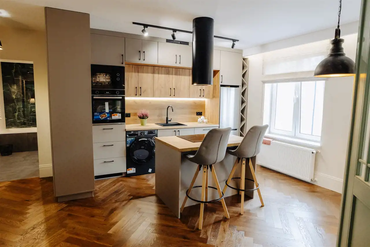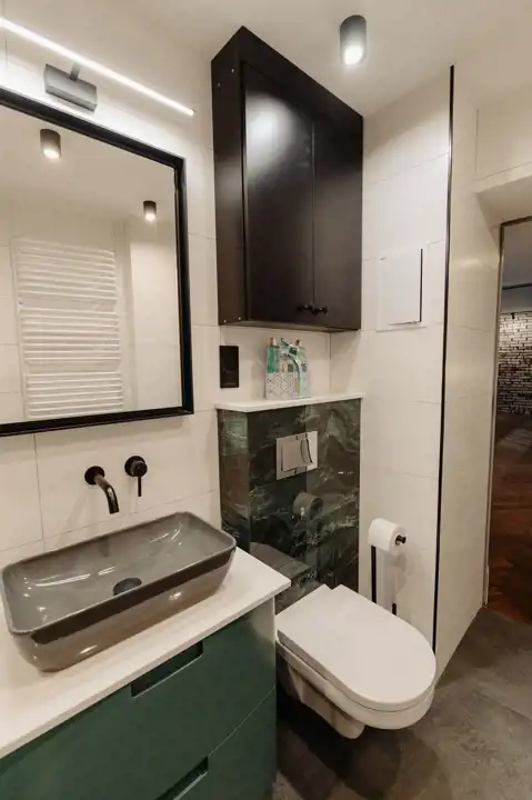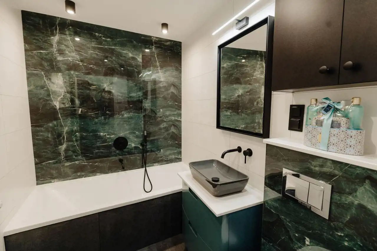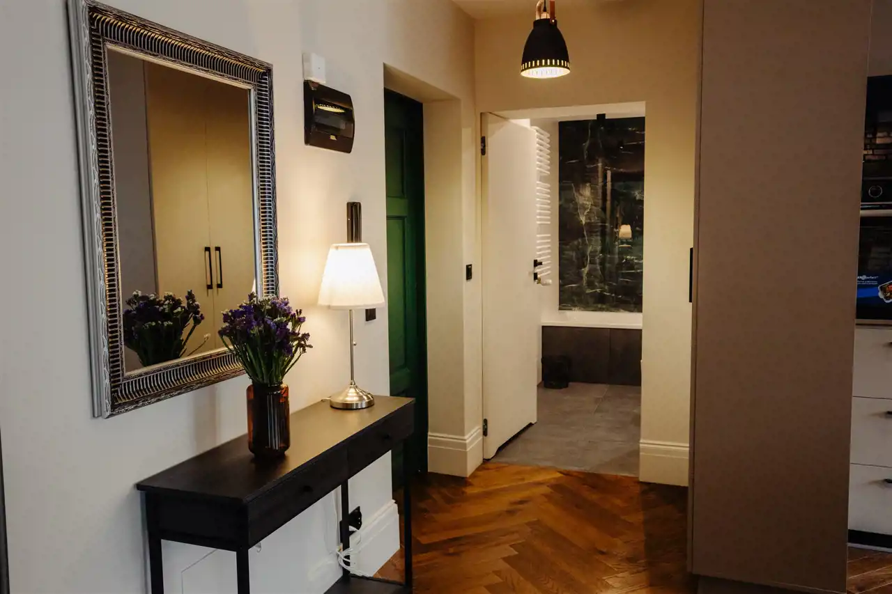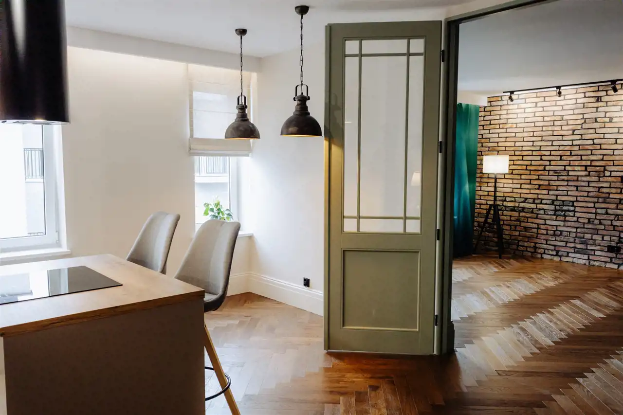 Apartament został wyremontowany przy użyciu materiałów renomowanych firm. Wymieniono instalacje elektryczne i hydrauliczne, podwieszono sufity. Między stropem a dachem ocieplono mieszkanie celulozą.