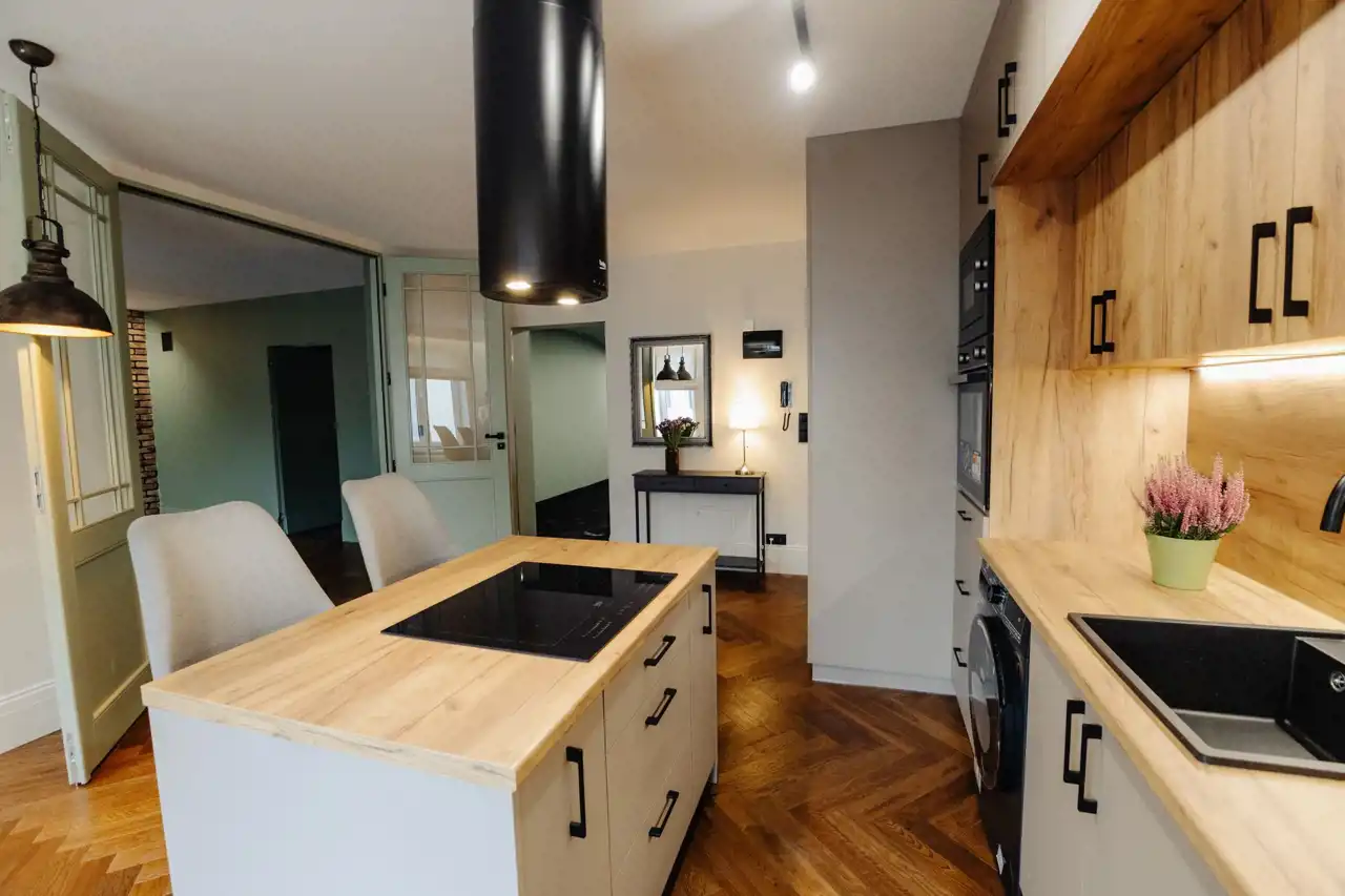 Aneks kuchenny zabudowano meblami na wymiar i wyposażono w nowe sprzęty AGD (karty gwarancyjne z dwuletnim okresem ważności).
