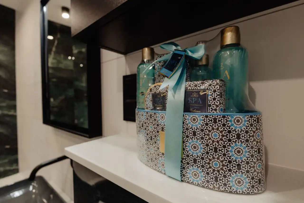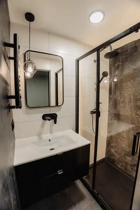 -sypialnia z wydzieloną łazienką wyposażona w kabinę prysznicową.