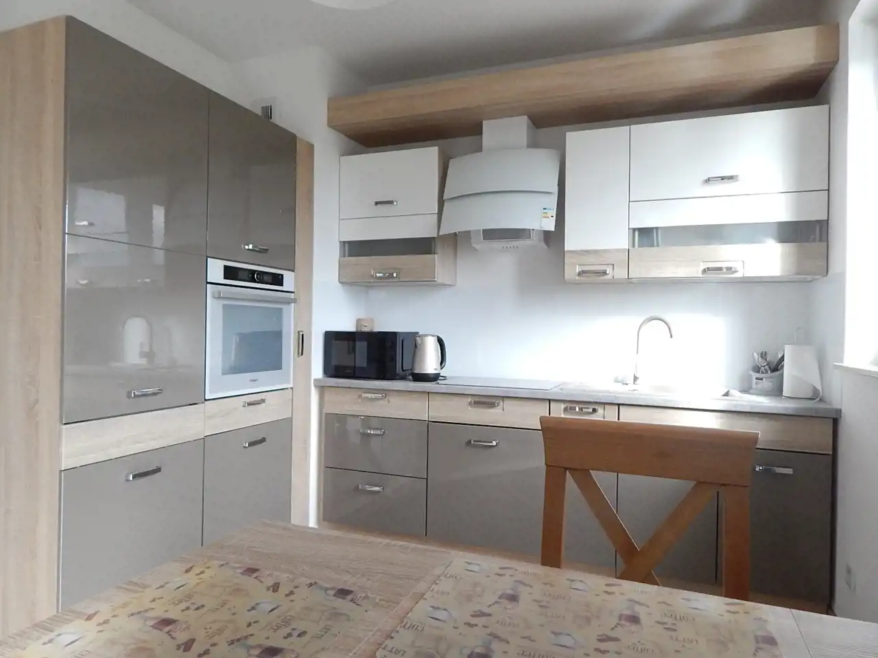 - kuchnia w zabudowie z AGD (płyta, lodówka, piekarnik, mikrofalówka);