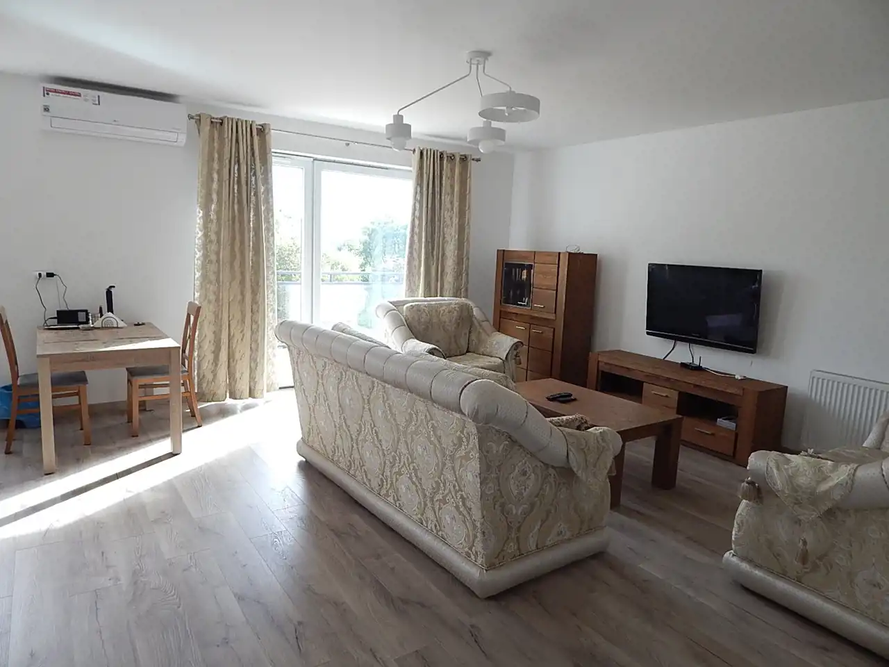 - salon: sofa, tv, klimatyzacja, szafka RTV, barek;