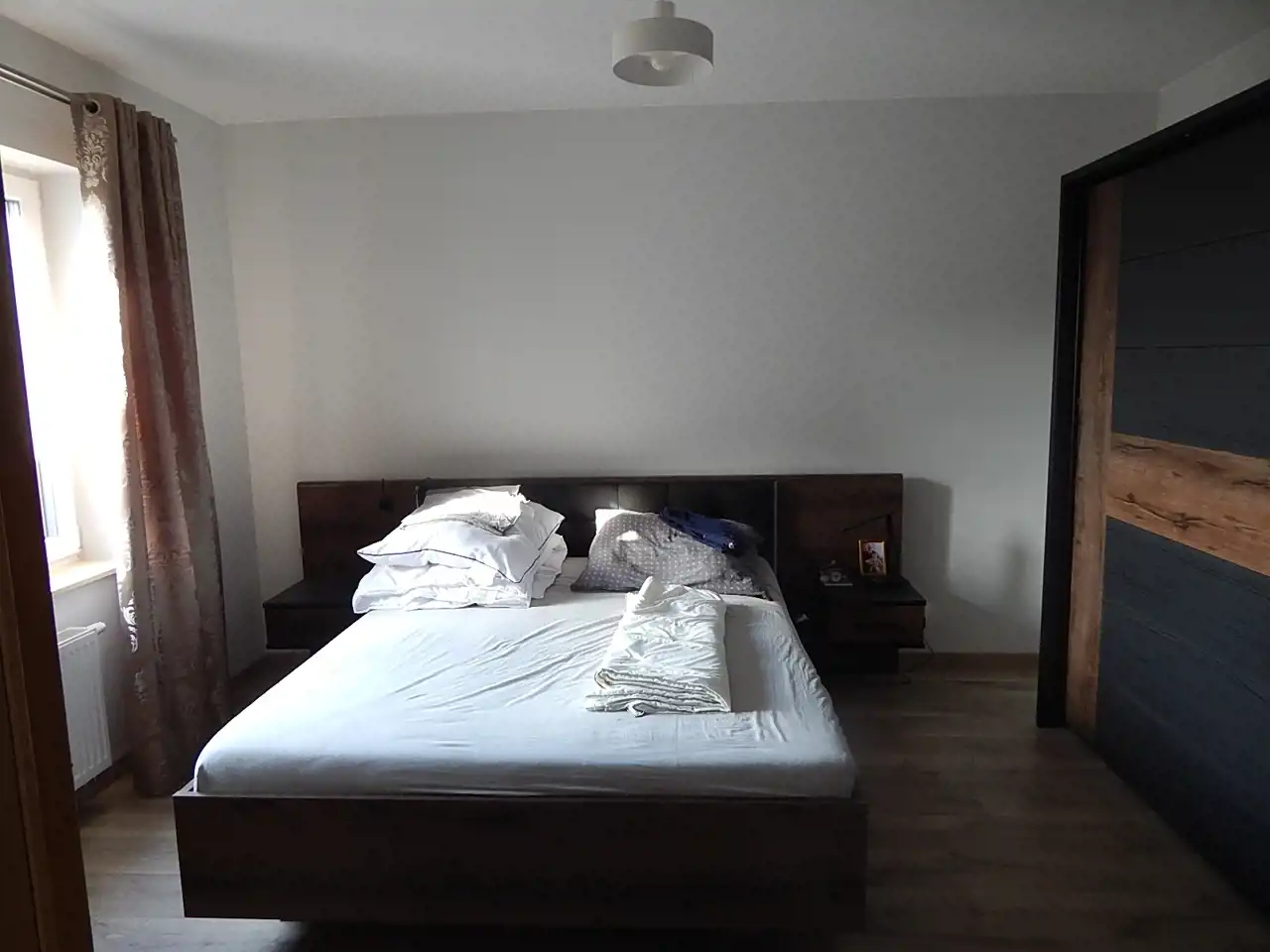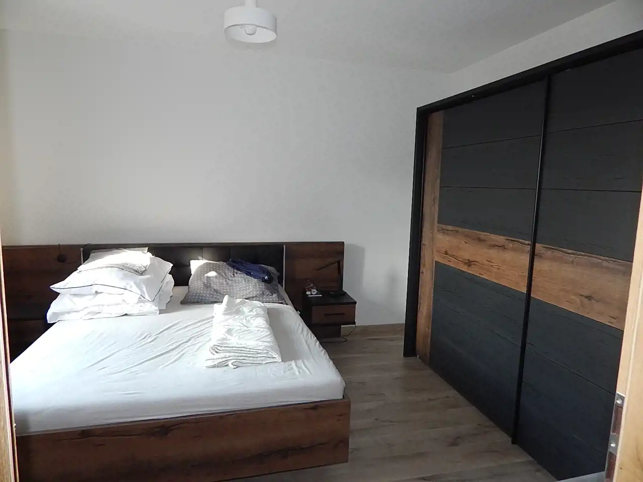 - główna sypialnia: łóżko-materac 160cm; duża szafa, komoda