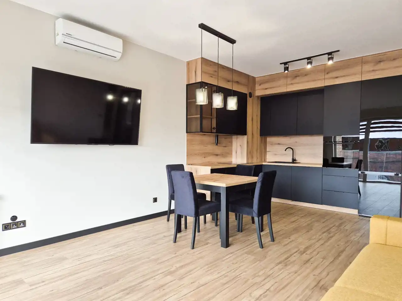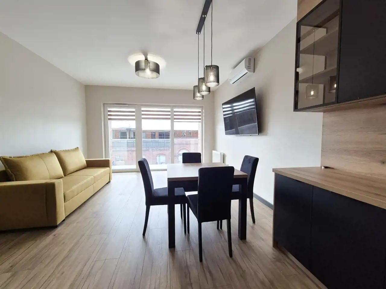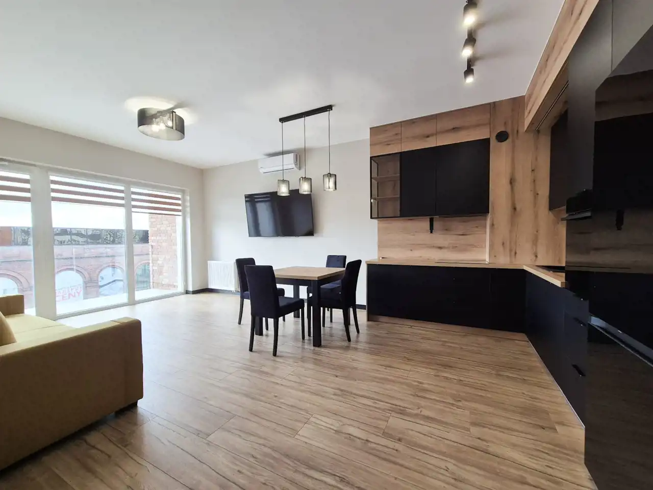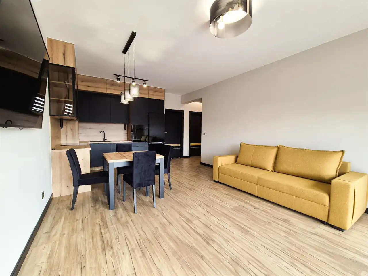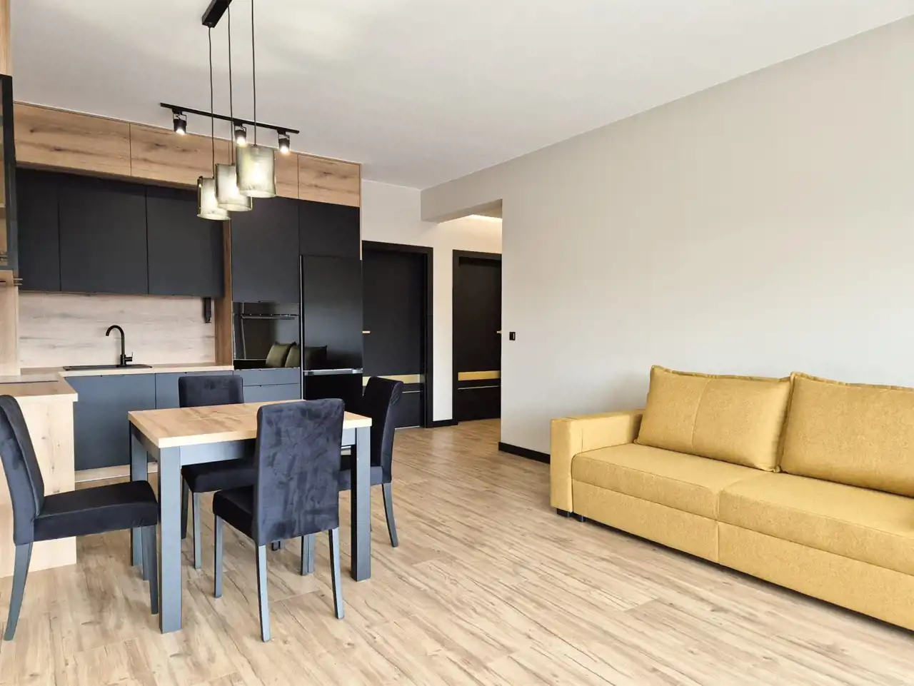 Mieszkanie świeżo oddane, wykończone przy użyciu materiałów wysokiej klasy. Umeblowane i wyposażone w sprzęty AGD i RTV. W salonie kpl. zabudowa kuchenna z AGD, stół z krzesłami oraz kanapa i fotele. W łazience kabina prysznic, pralka, kompakt WC, umywalka, zestaw mebli łazienkowych. W przedpokoju duża szafa w zabudowie. Drzwi antywłamaniowe. Na podłogach: terakota, w sypialni i pokoju panele. Okna PCV. Dodatkowo lokal posiada klimatyzację.