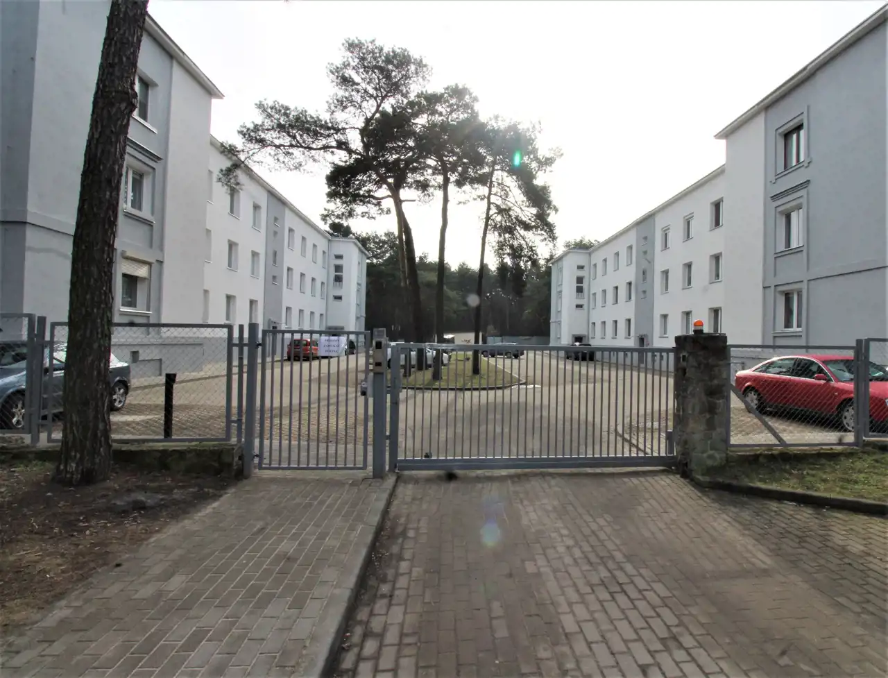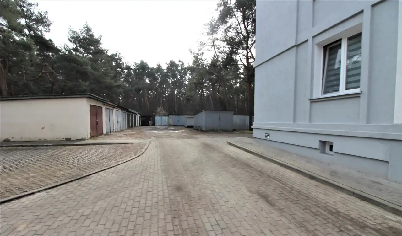 Nieruchomość znajduje się na terenie zamkniętym z bramą na pilota lub klucz, w bezpośrednim sąsiedztwie lasu oraz dwóch niskich budynków mieszkalnych.