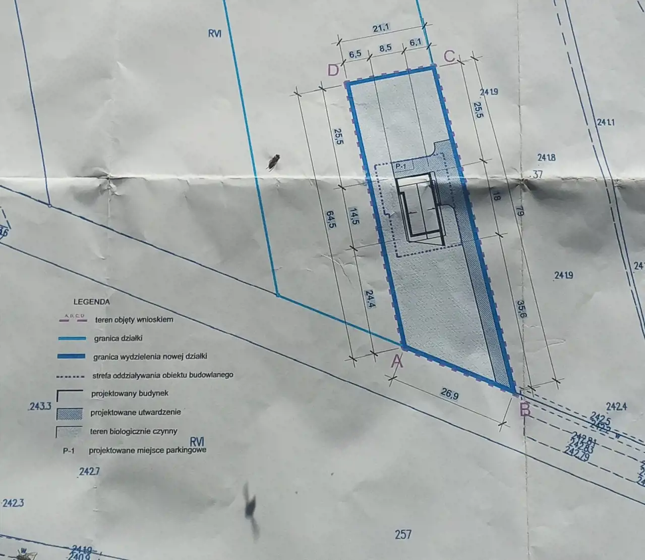 Przybliżone wymiary działki to 26,9 x 79 x 21,1 x 64,5