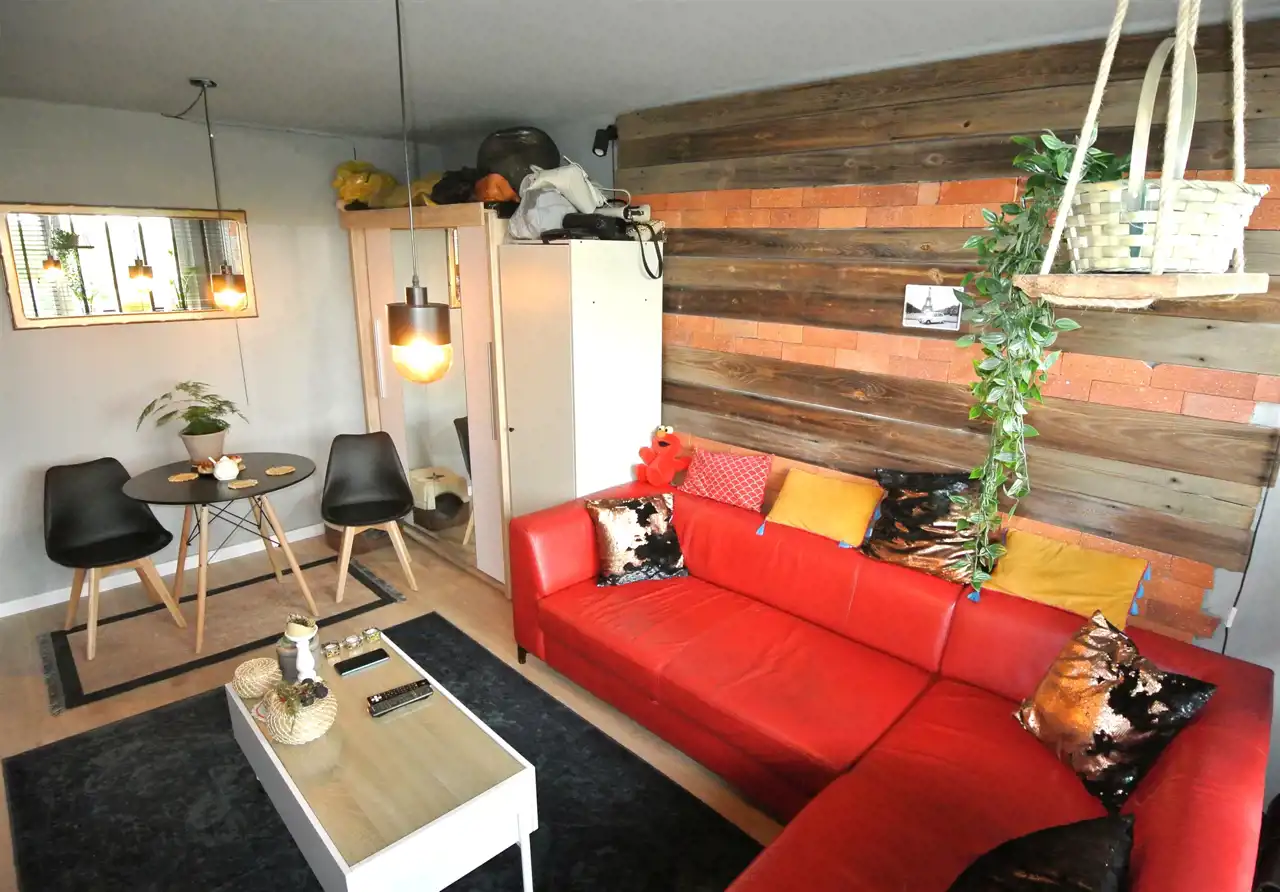 Flooring: panels in the rooms; tiles in the kitchen, bathroom, and hallway.