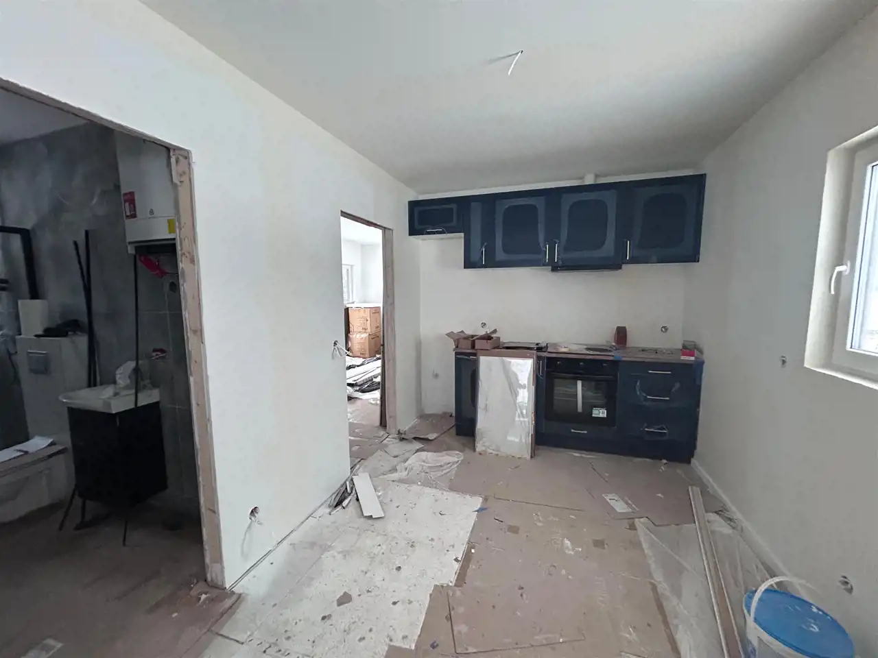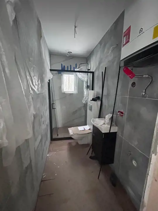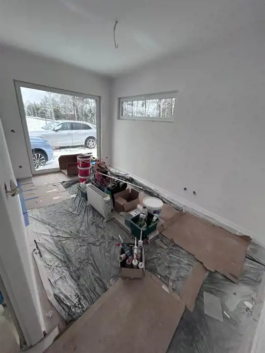 • Ściany: Pomalowane pierwszą warstwą farby, przygotowane do finalnego wykończenia.
