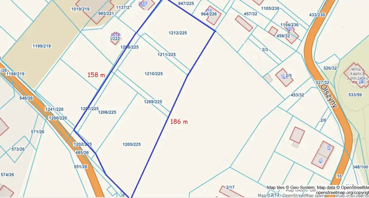 Wymiary nieruchomości: od frontu 90m x 186m x 59m x 158m