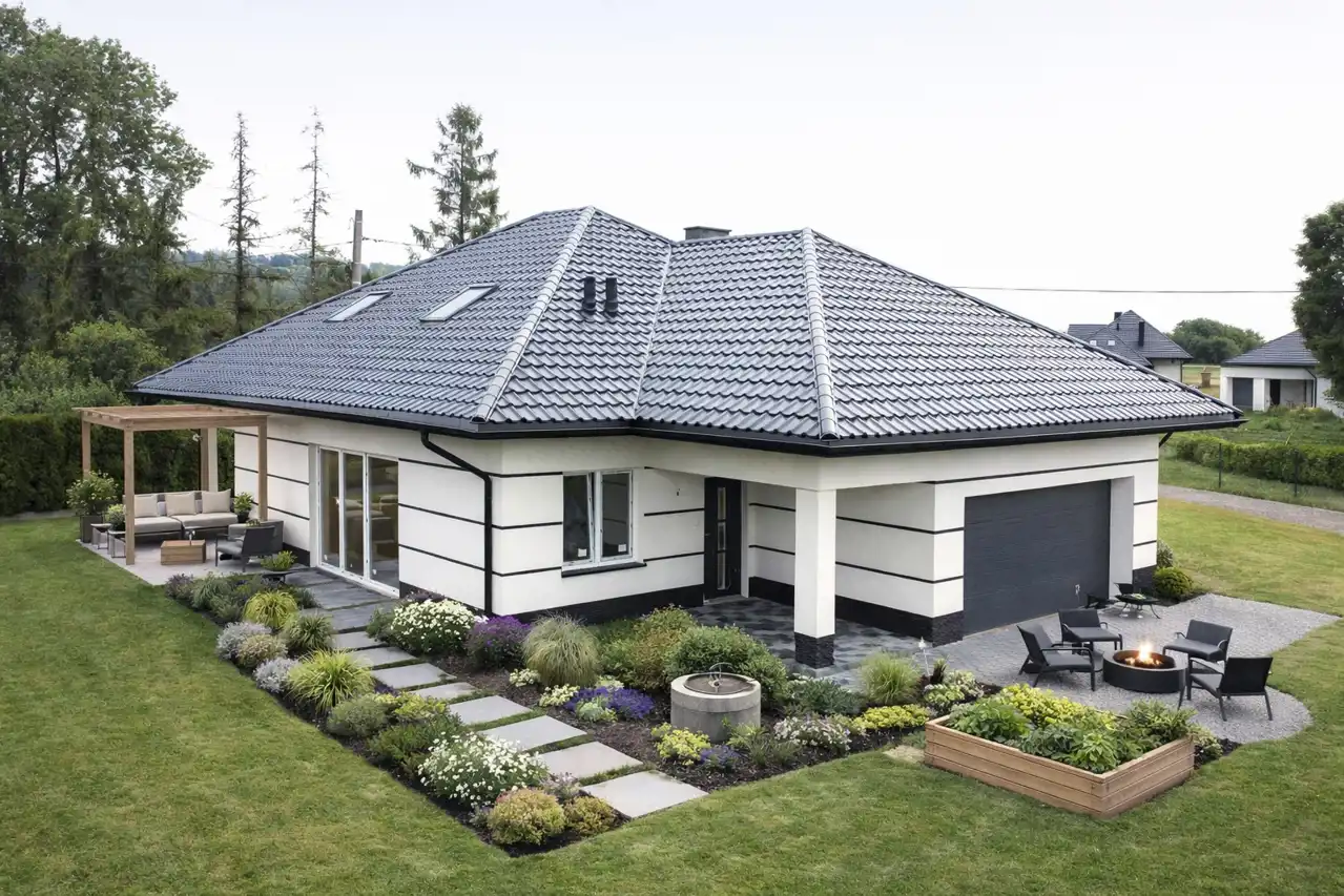 Niezwykle funkcjonalna nieruchomość zaprojektowana została ze szczególną dbałością o wygodę i komfort przyszłych właścicieli. Idealne miejsce dla osób chcących urządzić wnętrze według własnych potrzeb i preferencji. Nieruchomość wyróżnia starannie wykończona przestrzeń zewnętrzna, już od pierwszego dnia można cieszyć się estetyką otoczenia wokół domu. Dom posiada nowoczesną elewację w stonowanej kolorystyce, a dodatkowym atutem jest dwustanowiskowy garaż usytuowany w bryle budynku oraz ogrodzony teren działki i położona wokół obiektu nowoczesna płyta brukowa.