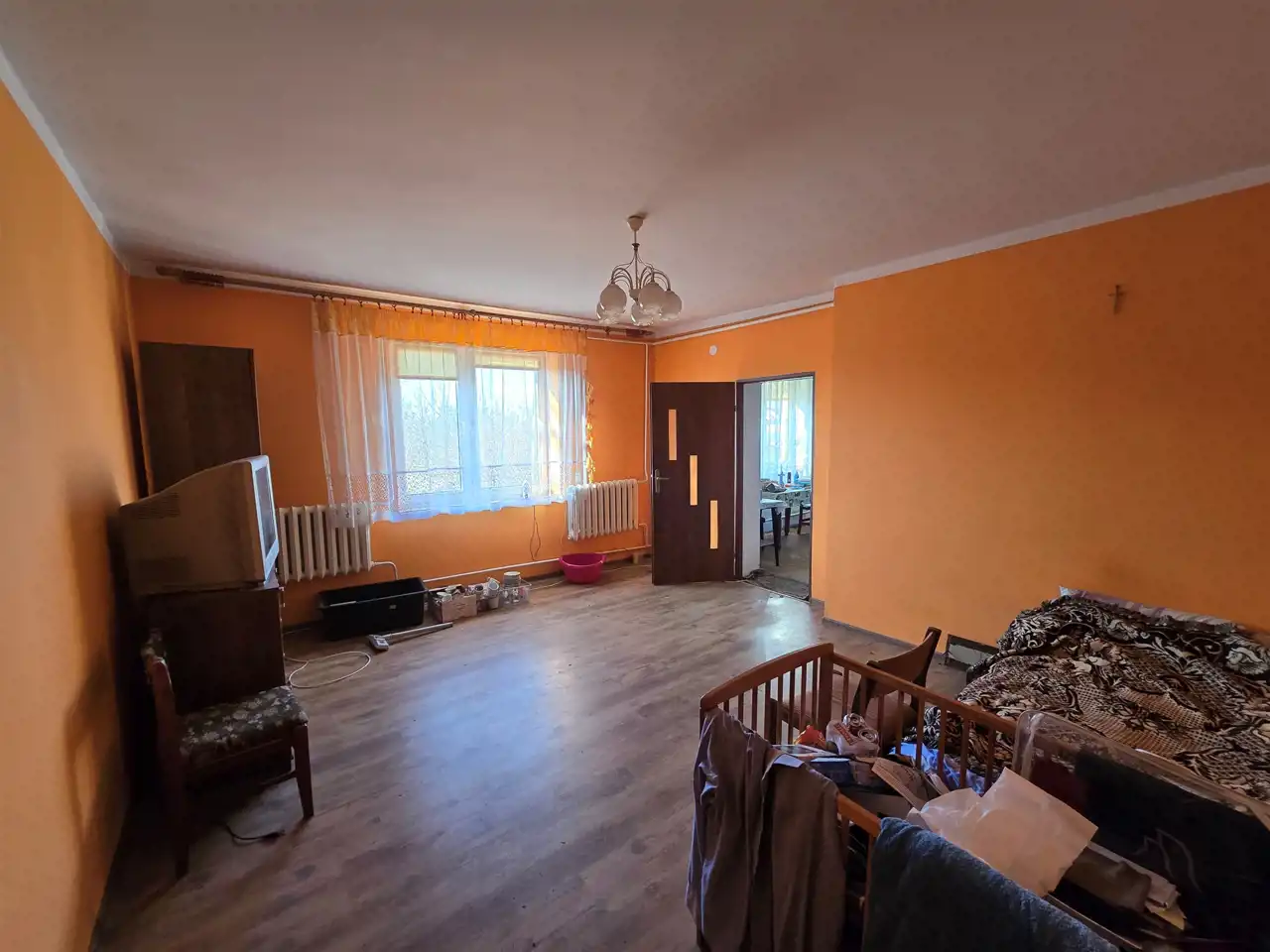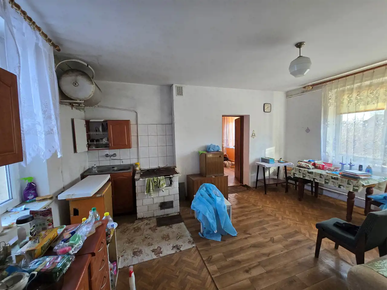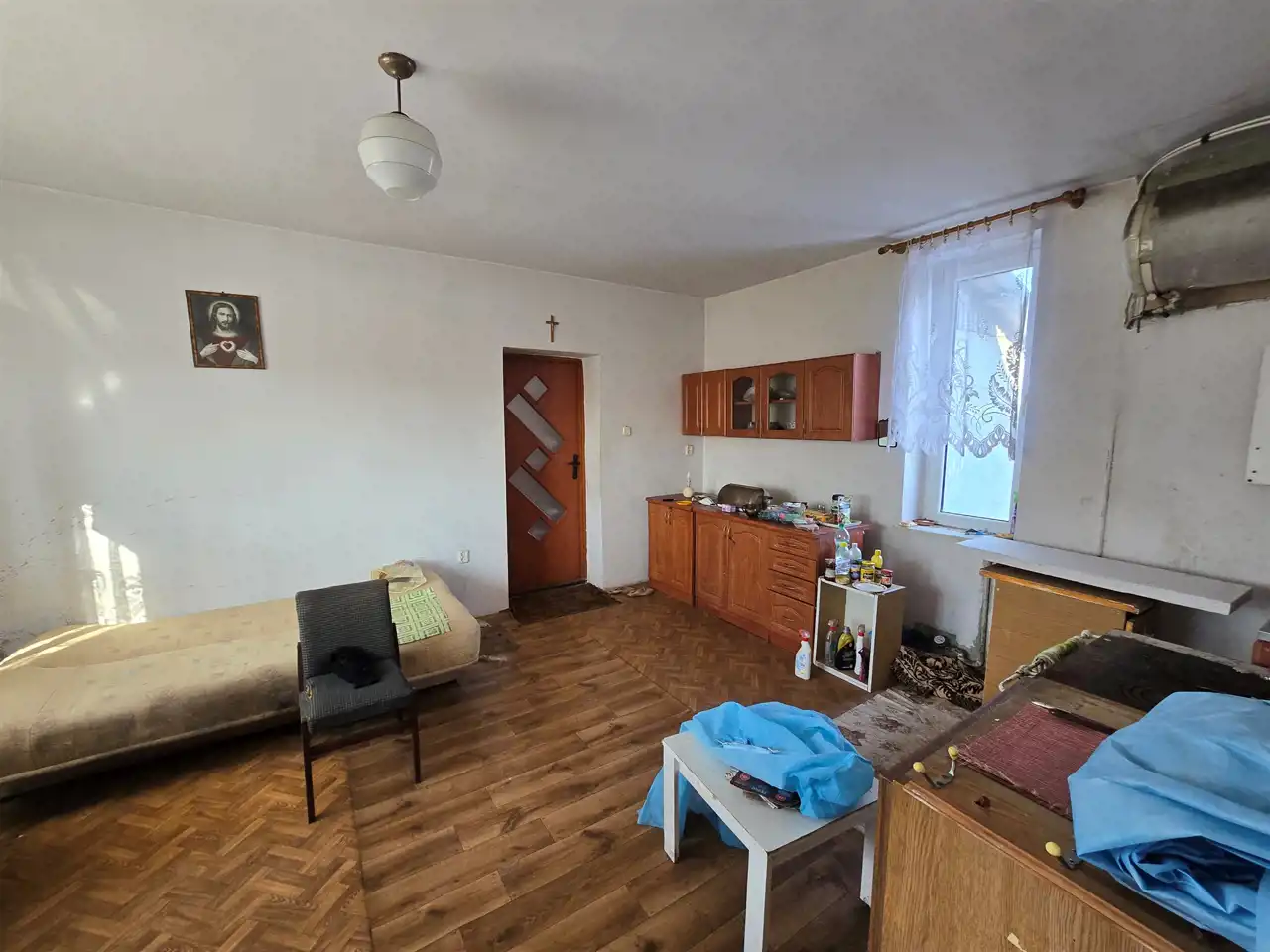 Budynek mieszkalny murowany kryty blachą trapezową, w nim duża kuchnia 5x5 m, duży pokój 5x5 m, przedsionek i pomieszczenie na łazienkę, dom ocieplony i otynkowany. okna PCV.