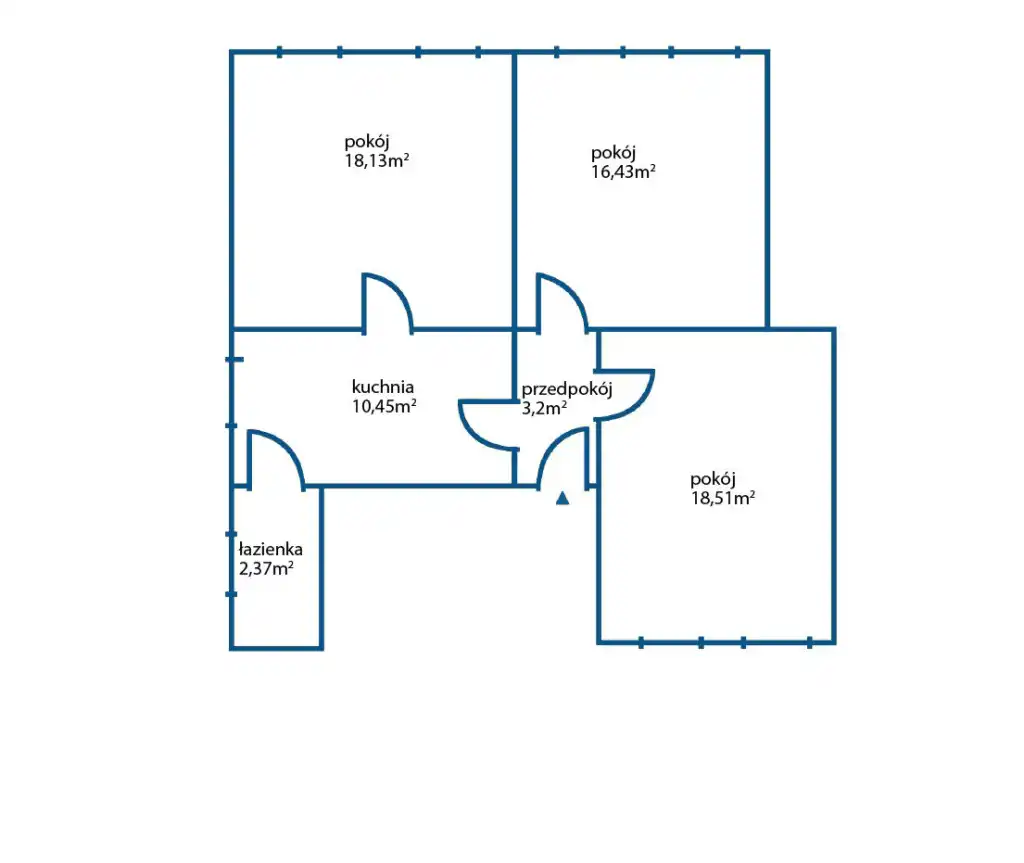 Lokal składa się z trzech pokoi o powierzchniach 18,51 m2, 18,13 m2 i 16,45 m2, kuchni o powierzchni 10,45 m2, łazienki o powierzchni 2,37 m2 oraz przedpokoju o powierzchni 3,20 m2.