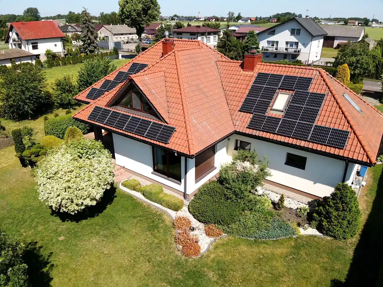 Pokrycie dachu – dachówka ceramiczna Wiekor. Drzwi wejściowe antywłamaniowe. Solidne okna drewniane wraz ze sterowanymi elektrycznie roletami antywłamaniowymi.