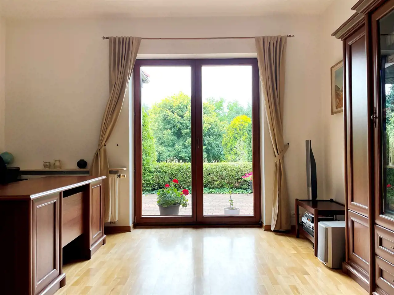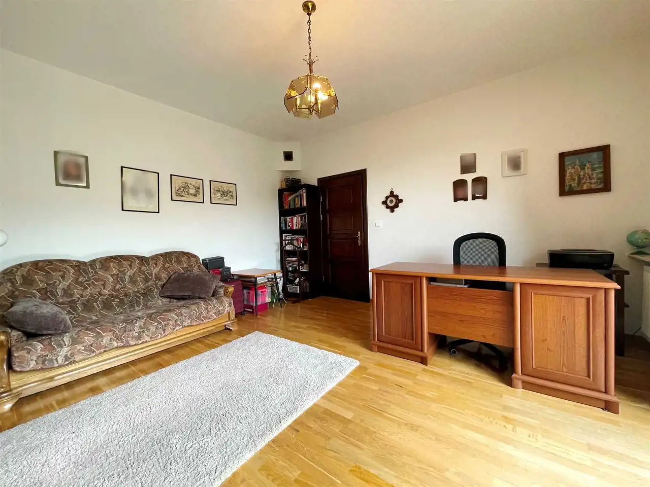 Na parterze znajduje się również wygodny gabinet z wygodnym biurkiem i miejscem do biznesowych rozmów. Meble widoczne na zdjęciach są uwzględnione w cenie ofertowej domu.