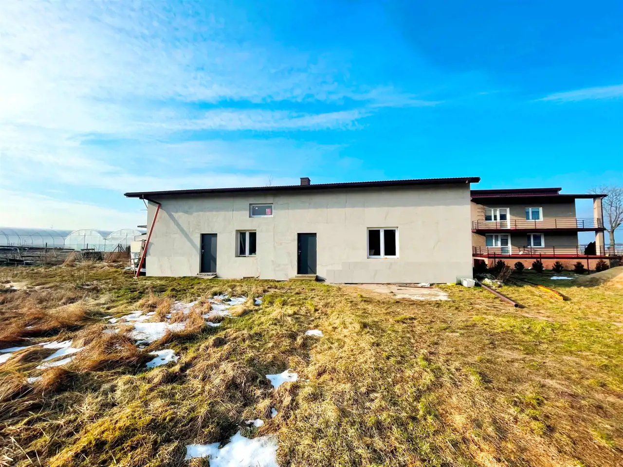 W drugim budynku , który jest podzielony na dwa mieszkania z niezależnymi wejściami znajdziemy 8 pokoi, 2 kuchnie i dwie łazienki.