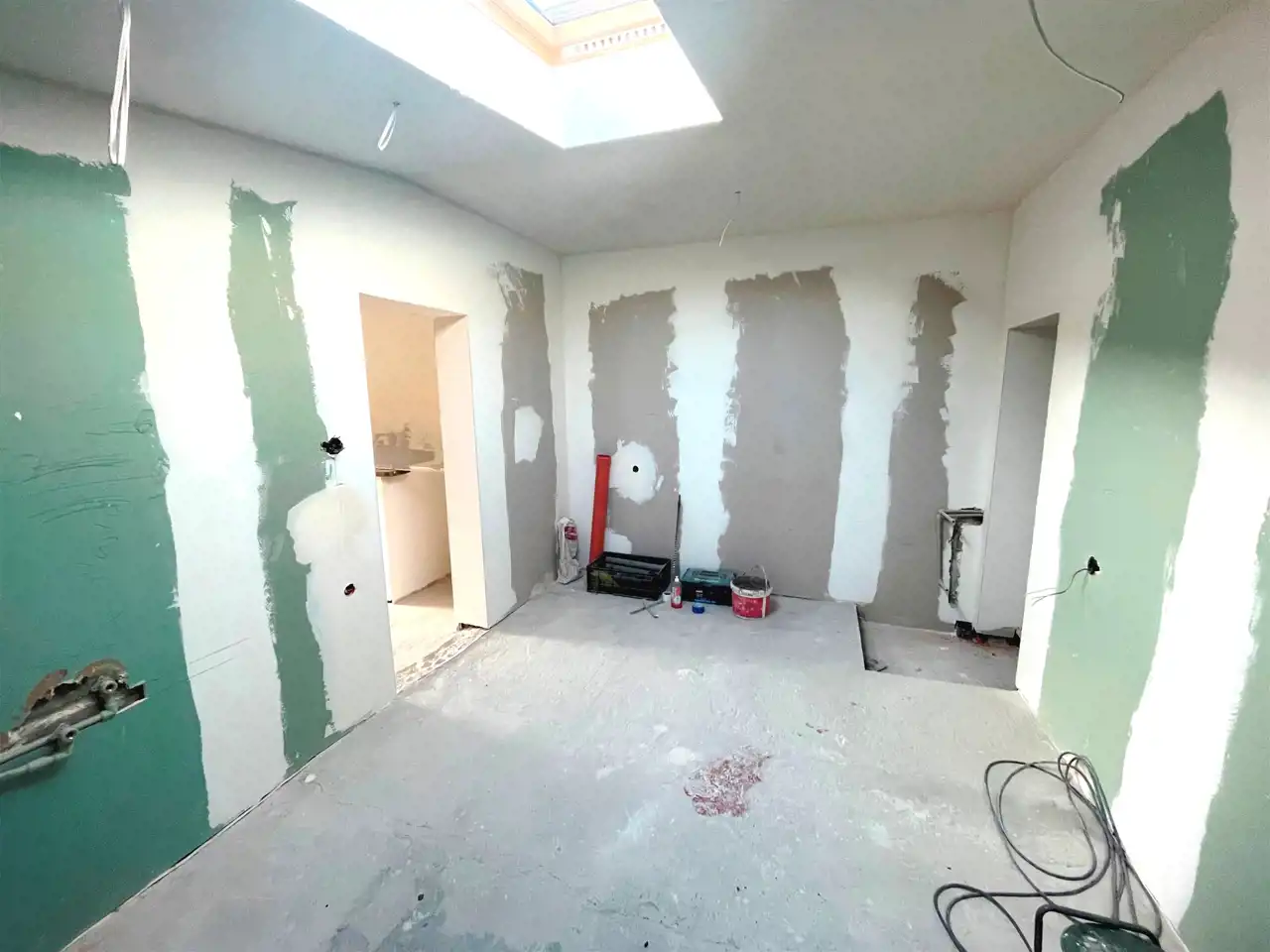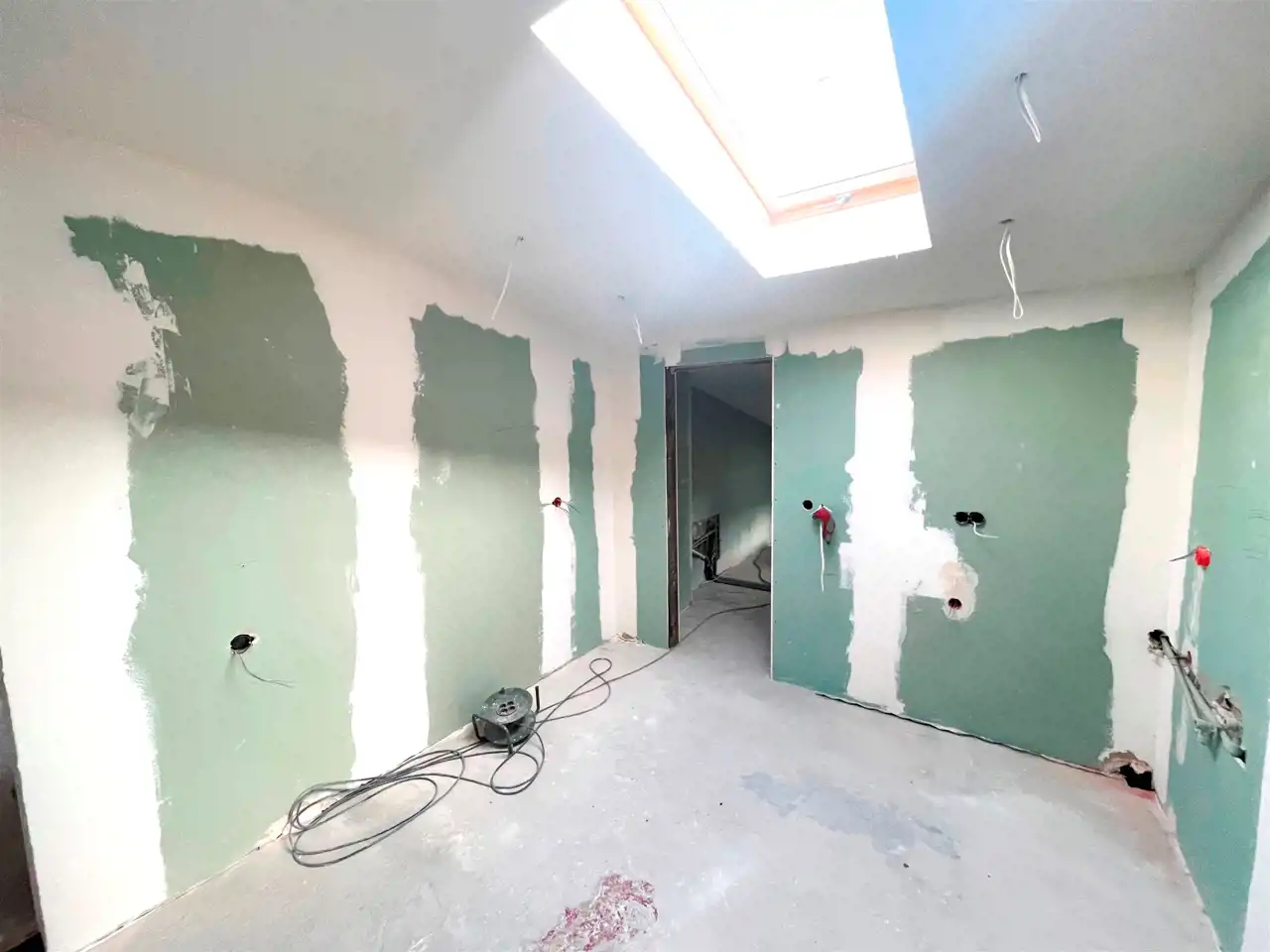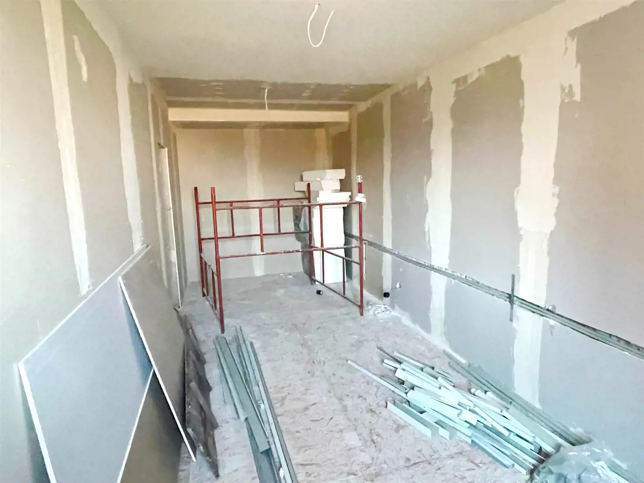 Prace remontowe polegały na : wymianie instalacji wodno-kanalizacyjnej, wymianie instalacji elektrycznej, wymianie okien, położeniu gładzi oraz płyt karton/gips.