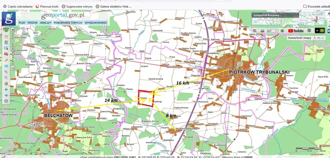 Odległości: Do Woli Krzysztoporskiej 8 km, Piotrkowa Trybunalskiego 16 km, Bełchatowa 14 km