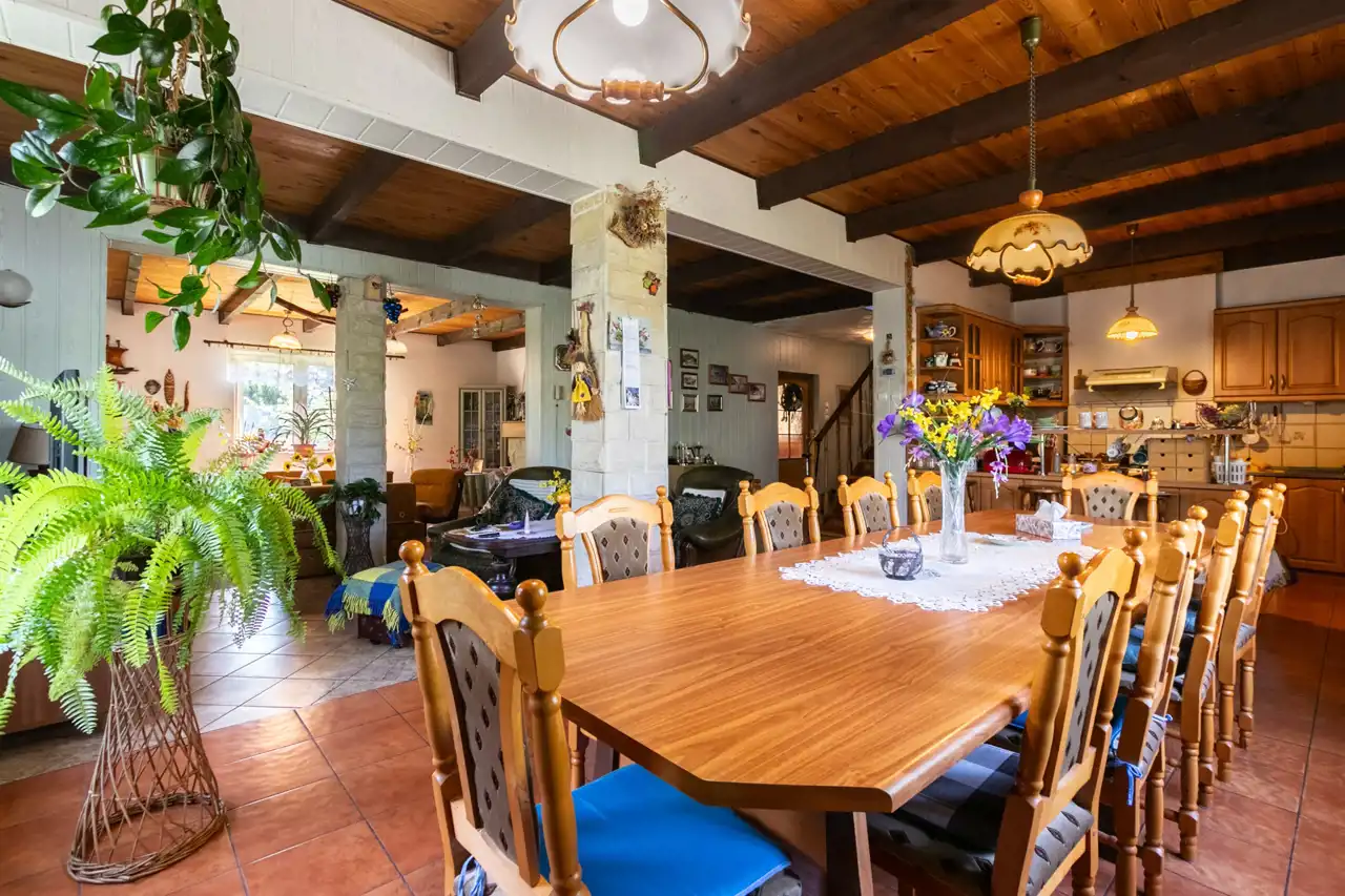 kuchnia z jadalnią i przestronnym salonem (kominek)