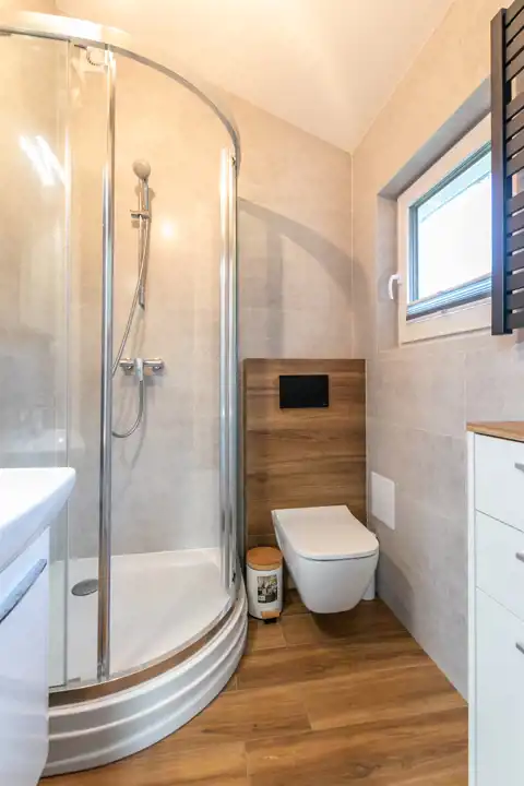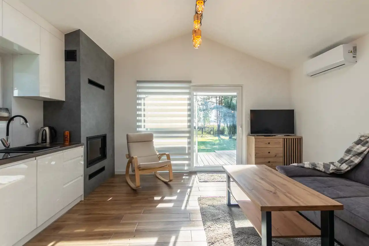 W domku znajduje się salon z kuchnią, sypialnia oraz łazienka z wc.