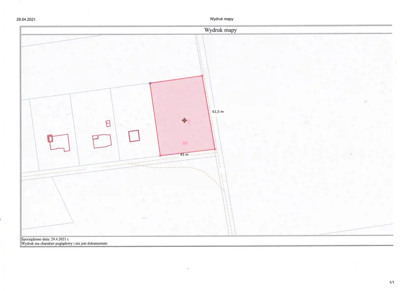 Działka o kształcie prostokąta i wymiarach 45x61 m. Działka zadrzewiona (samosiejki mieszane drzewa kilkuletnie).