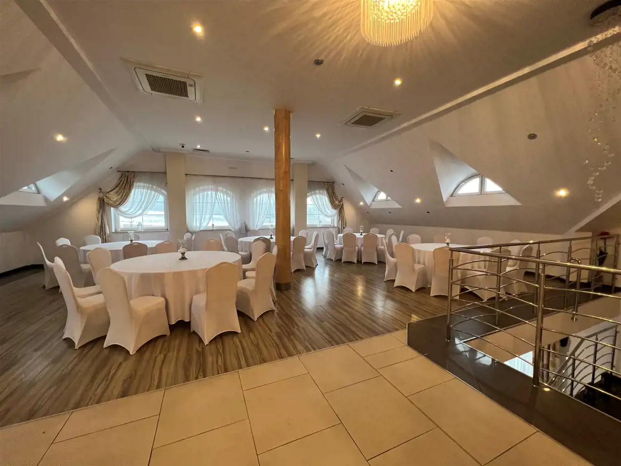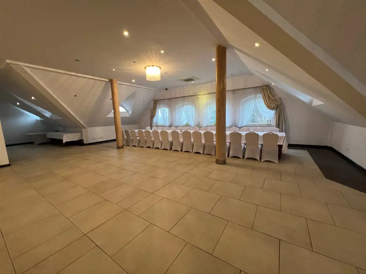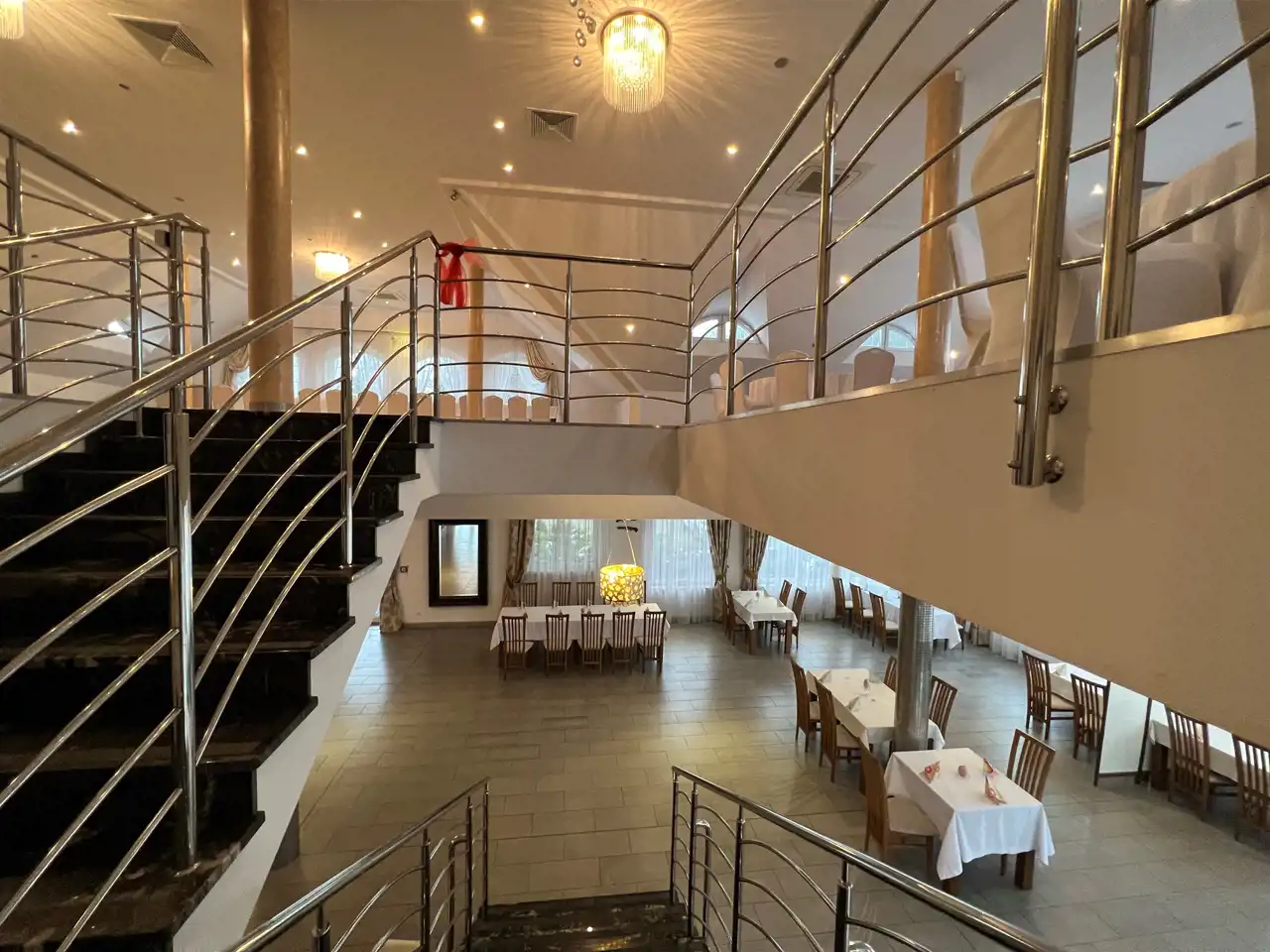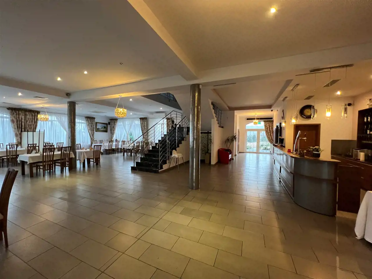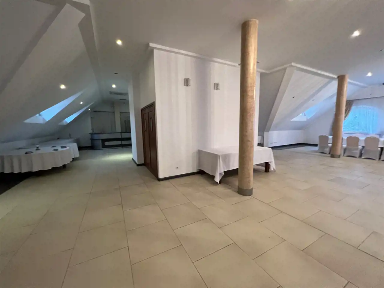 Restauracja posiada 1000 m użytkowe wewnatrz tj parter oraz I piętro. Restauracja posiada około 20 pomieszczeń stanowiących, recepcję, barek szatnie, pomieszczenia gospodarcze, magazynowe, kuchnie 4 łazienki plus łazienki dla pracowników, pokój dla młodej pary wraz z pokojem noclegowo/ mieszkalnym stanowiący 140 m2 (4pokoje)
