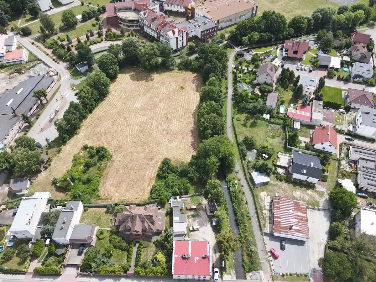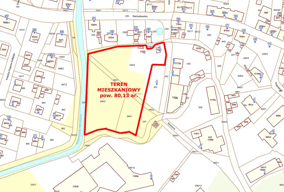 Sprzedaż bardzo atrakcyjnej, niezabudowanej działki budowlanej o powierzchni 80,13 ar (8013 m2) położonej w Centrum miasta Wołczyn, przy Rynku, rejon ulicy Namysłowskiej i Rzecznej, powiat kluczborski, województwo opolskie. Według miejscowego planu zagospodarowania przestrzennego Gminy Wołczyn, cały teren działki, łącznie składającej się z 4 działek, oznaczony jest symbolem MN - tereny zabudowy jednorodzinnej mieszkaniowej. Działki złączone w całości, posiadają nieregularny kształt zbliżony do dużego prostokąta, nachylenie terenu płaskie.Teren nie zalewowy z dostępem do drogi publicznej z jednej strony. Z pozostałych trzech stron jest ogrodzenie oraz drzewa. Działka posiada uzbrojenie w kanalizację, wodę oraz prąd miejski. Cały teren z dwóch stron graniczy z zabudową domów jednorodzinnych oraz oświetloną ścieżką pieszą, z trzeciej strony znajduje się duży kompleks szkolny, wyposażony w boisko. Całość terenu, umożliwia wydzielenie kilkunastu mniejszych działek pod budowę domów w zabudowie wolnostojącej, bliźniaczej lub szeregowej wraz z wewnętrznymi drogami dojazdowymi. Spokojna, urokliwa i nieuciążliwa lokalizacja, zadbana i rozbudowująca się miejscowość. W pobliżu pełna infrastruktura sklepy, szkoły, przedszkola, apteki. Atrakcyjna Działka dla developera.