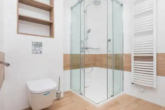 Prysznic, WC, umywalka, suszarka do włosów, lustro, ręczniki, pralka