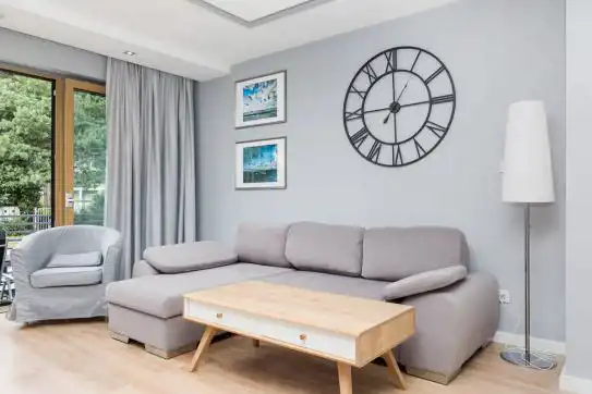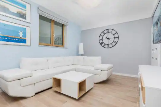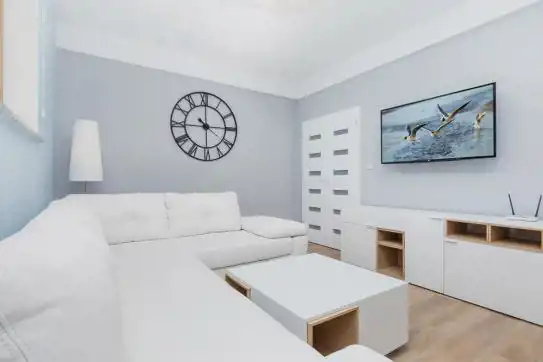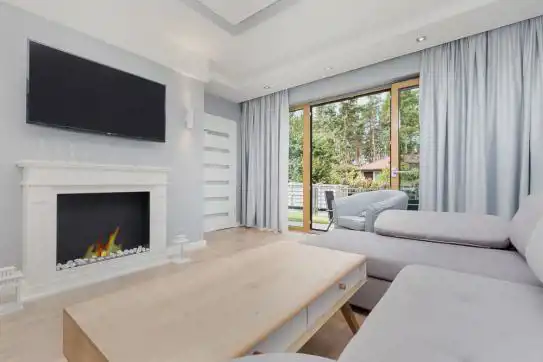 Sofa rozkładana, szafki, SmartTV, biokominek, wyjście na taras