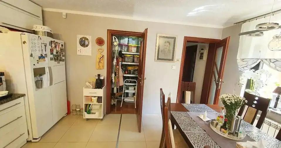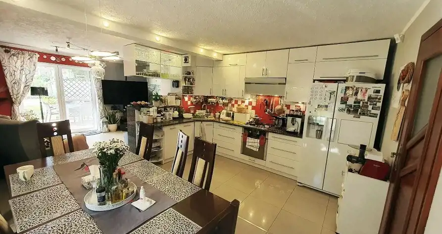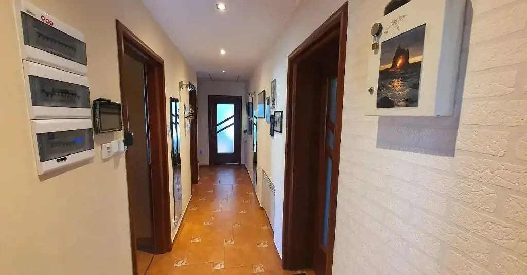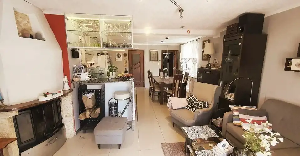 - Parter: salon z aneksem kuchennym 35 m2 z grubymi kamiennymi blatami na szafkach i parapetach w ciemnym kolorze, na podłodze terakota, pomieszczenie gospodarcze, hol, pokój/biuro 12m2, łazienka (natrysk, wanna, bidet, umywalka), osobno WC , sypialnie 12/12m2 (całość około 100m2),