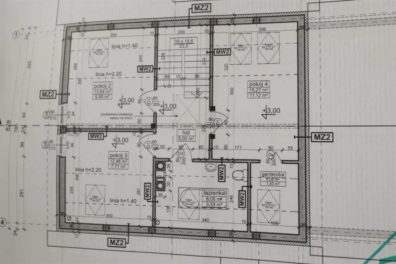 Na piętrze położone są trzy sypialnie, największa po podłodze powierzchnia 15,27 m2 plus garderoba; duża łazienka, przedpokój.