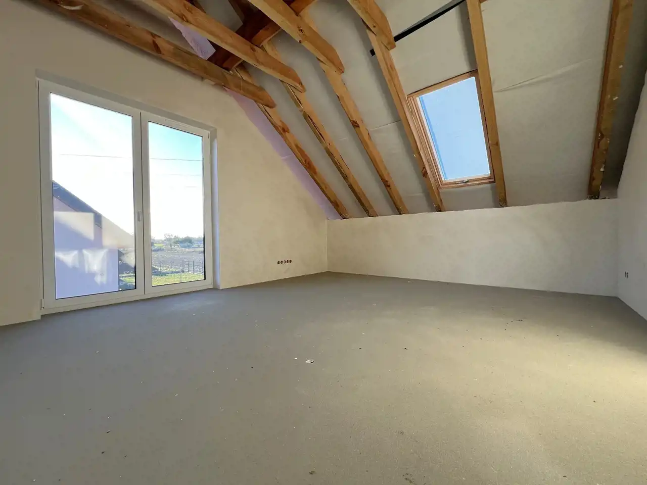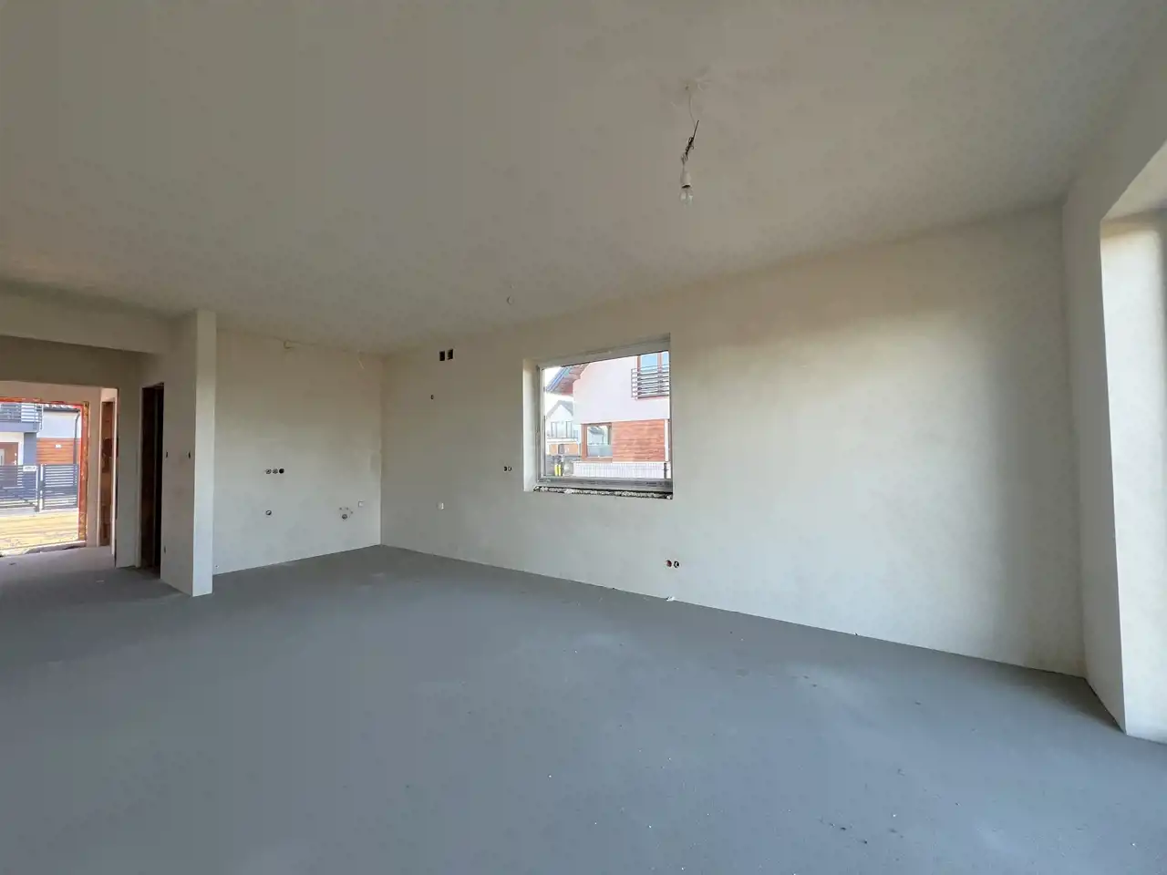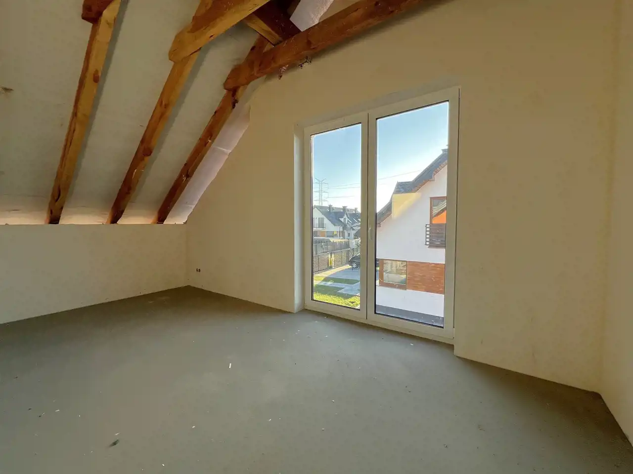 W poziomie parteru dobrze doświetlony salon połączony z aneksem kuchennym, pokój, wiatrołap z miejscem na dużą szafę, mała łazienka z miejscem na kabinę prysznicową, kotłownia z oknem oraz garaż. W salonie miejsce na zainstalowanie kominka. Z salonu wyjście na taras wyłożony kostką. Na piętrze trzy sypialnie, duża łazienka z oknem, przedpokój.