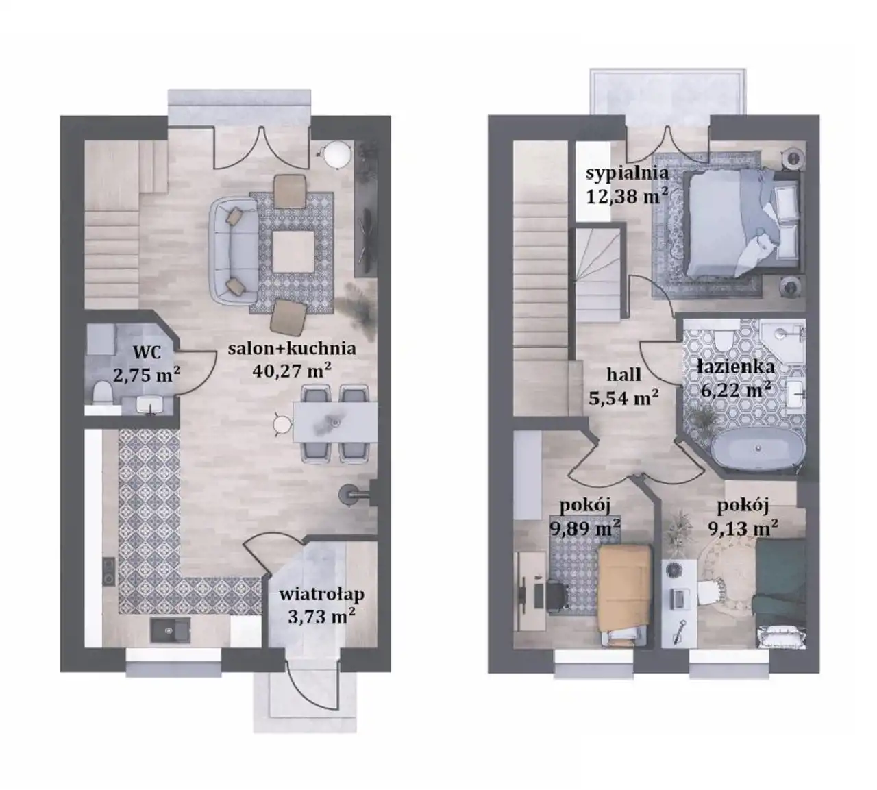 - pokoje: 12,38 m2 / 9,89 m2/ 9,13 m2;