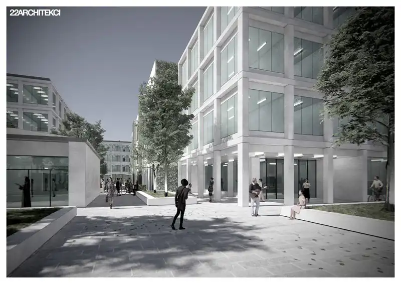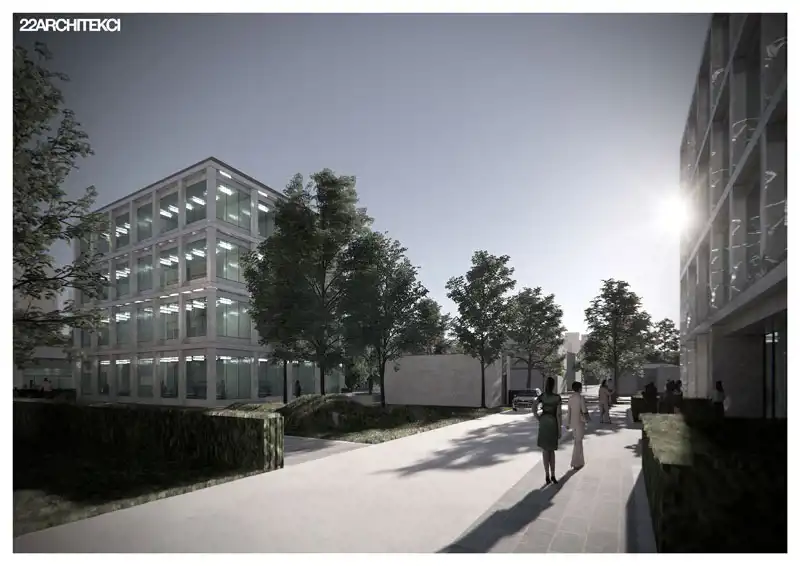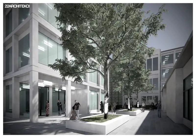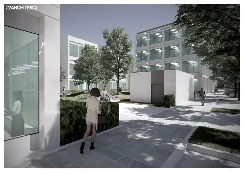 Zgodnie z obowiązującym miejscowym planem zagospodarowania przestrzennego koncepcja architektoniczna zakłada przebudowę i rozbudowę (pionową i poziomą) istniejącego budynku techniczno-biurowego wraz z jego adaptacją na budynek usługowy posiadający: