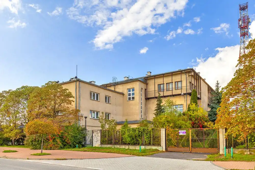 Budynek biurowy na dużej działce w Wołominie, w pobliżu przystanku autobusowego.