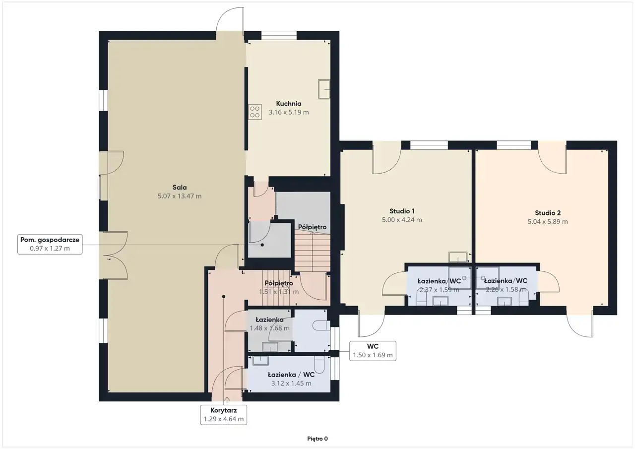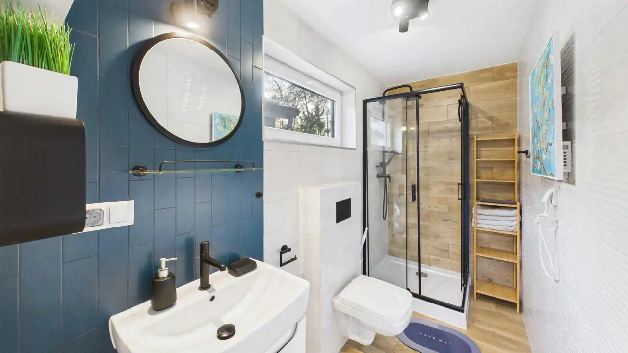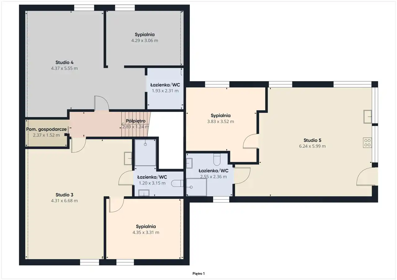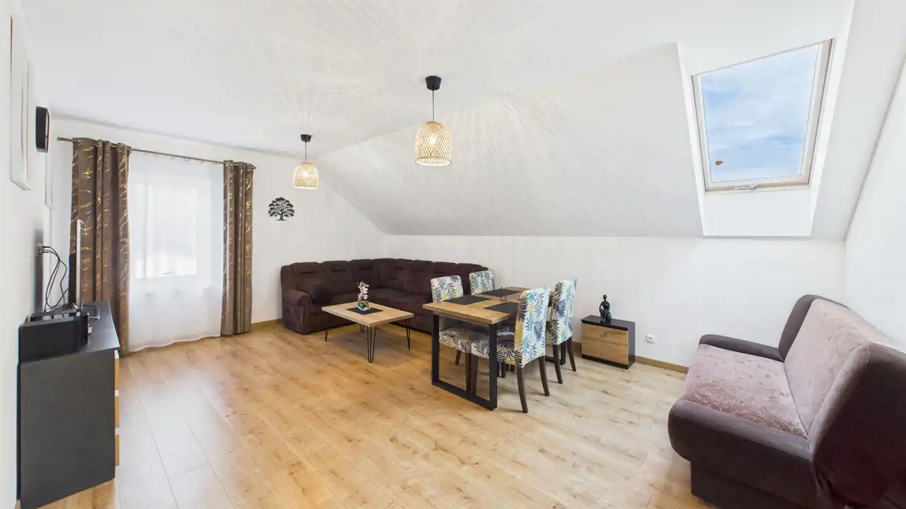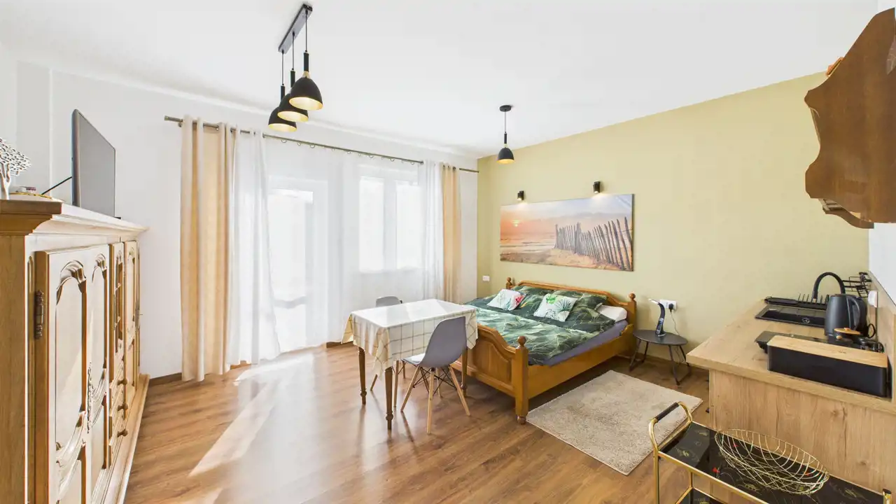 - 5 apartamentów (1- lub 2-pokojowe) – każdy z własną łazienką i kuchnią