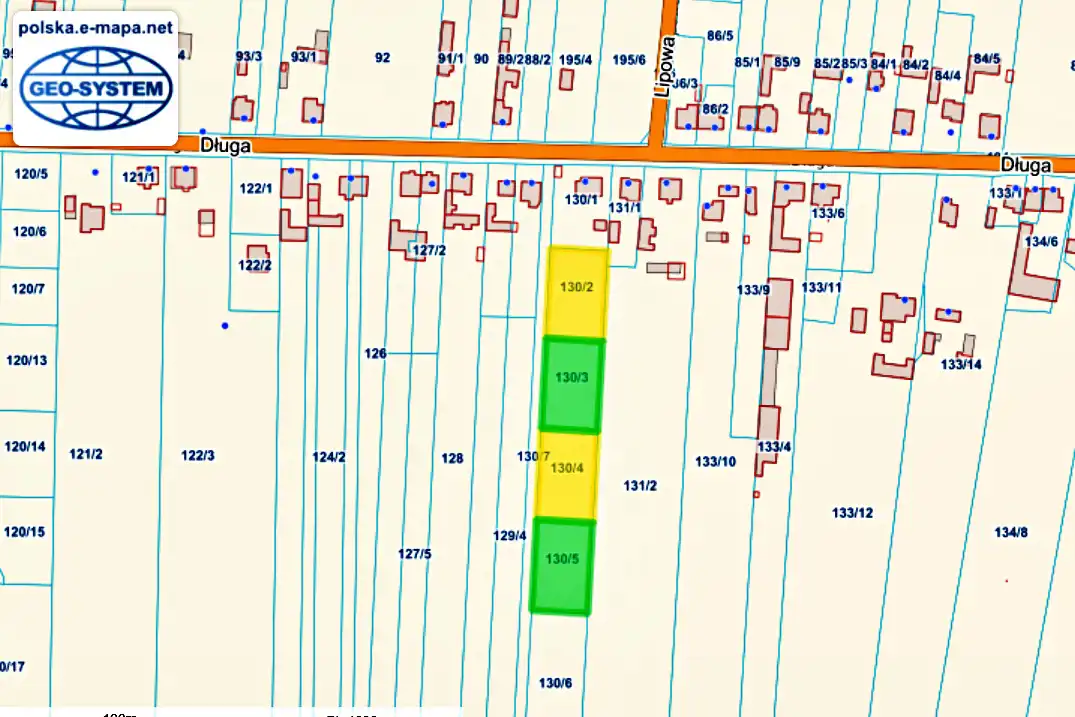 Nieruchomość o numerze ewidencyjnym 130/3 ma powierzchnię około 1400 m² i bardzo korzystne proporcje, które dają duże możliwości zagospodarowania terenu.
