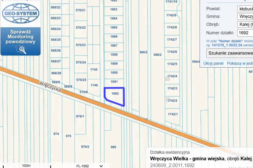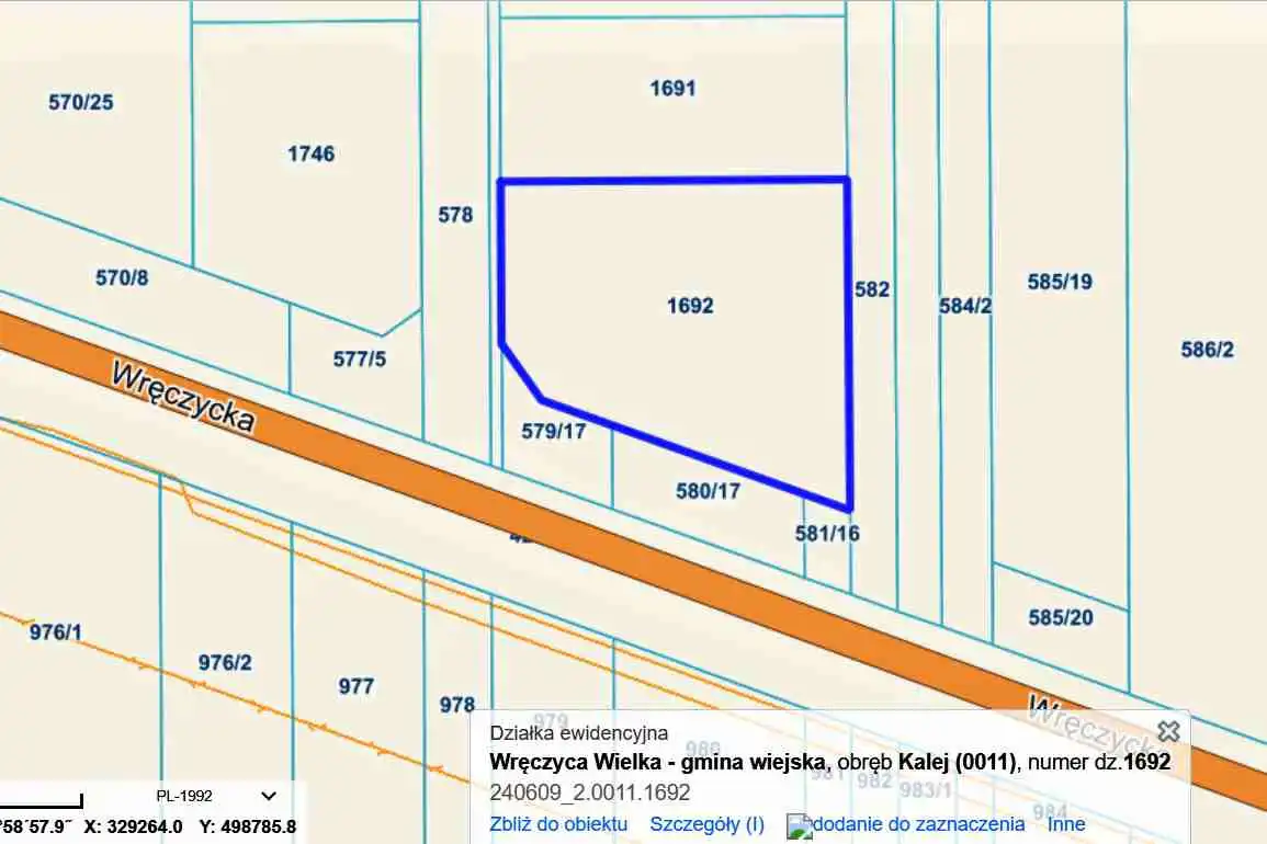 Nieruchomość oznaczona numerem ewidencyjnym 1692 usytuowana jest w rozwijającej się, intensywnie zabudowującej się części miejscowości, przy skrzyżowaniu ulic Wręczyckiej i Kowalskiej.