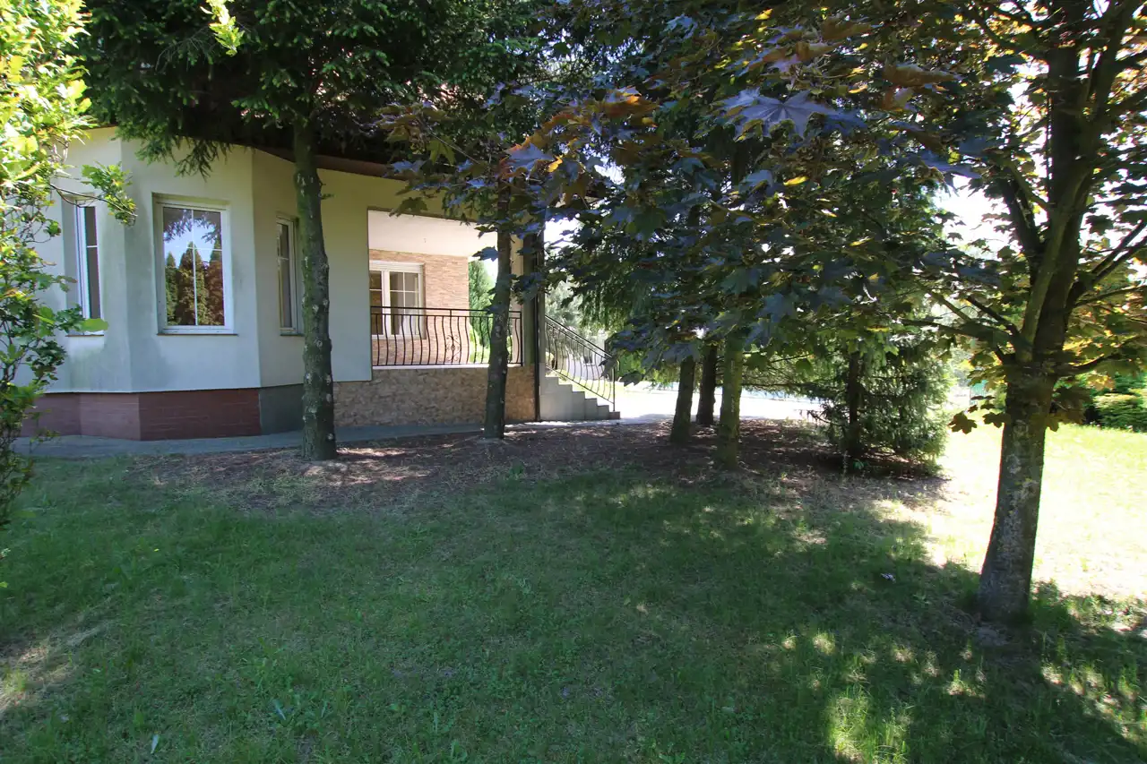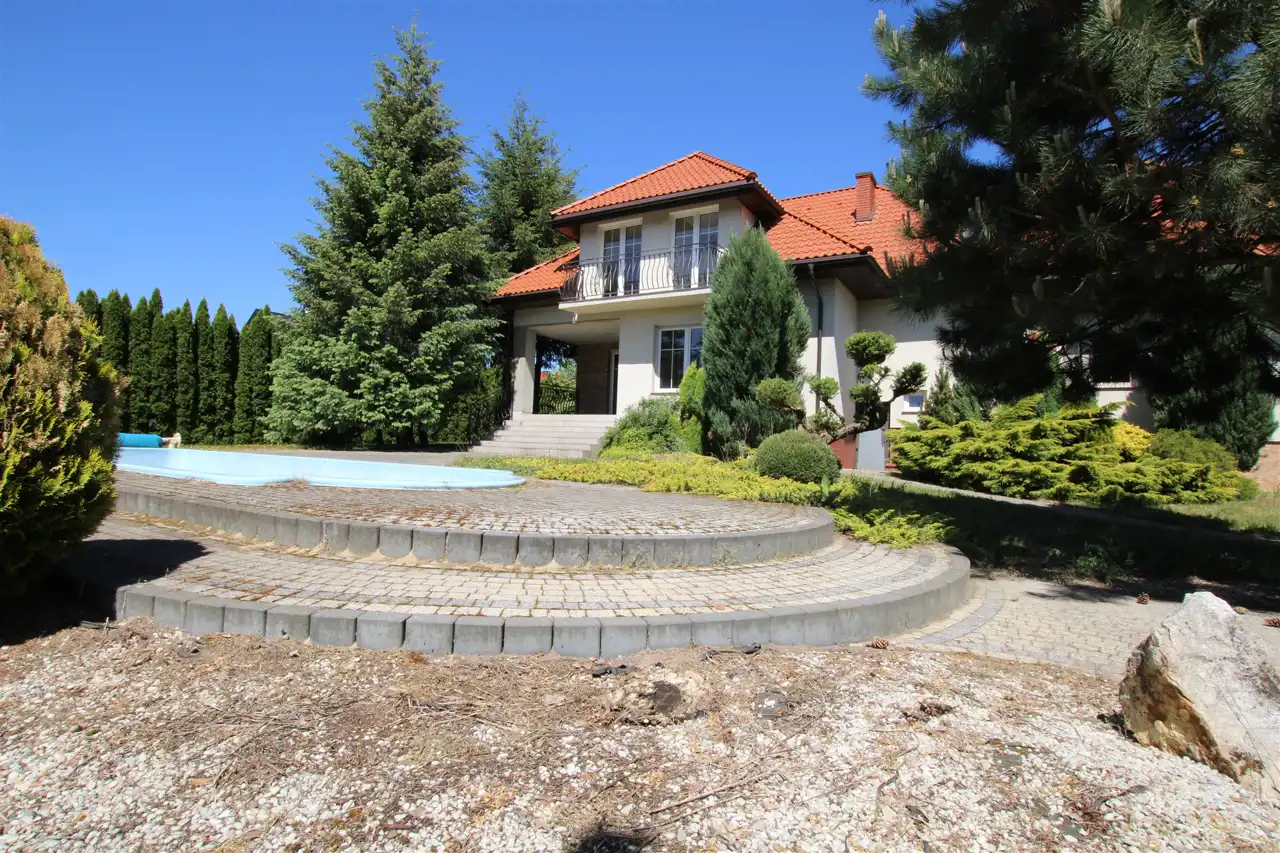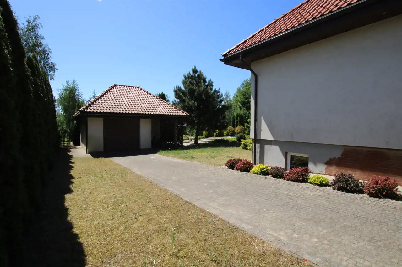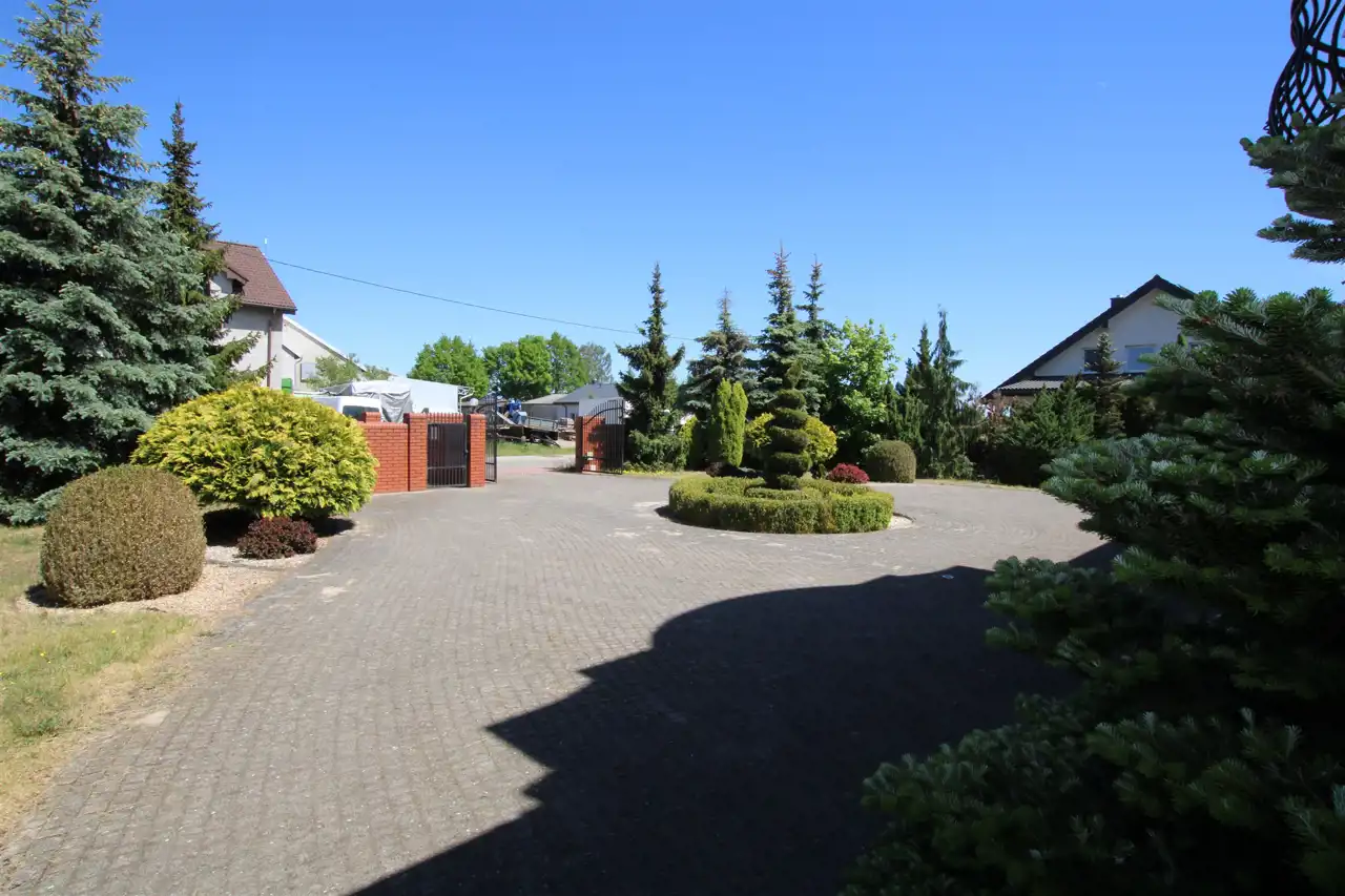 Działka pierwsza o powierzchni 1884 m2, której front stanowi wjazd została zagospodarowana kostką brukową, pozostała część to trawnik z wieloletnimi nasadzeniami krzewów ozdobnych, cała działka z wykonanym nawodnieniem oraz siatką przeciw kretom. Tył działki stanowi zaciszną część wypoczynkową z basenem o wymiarach 9m x 3m i głębokości 1,60m z wirem wodnym i pompą ciepła do ogrzewania wody. Na działce znajduje się również domek gospodarczy z garażem, letnią kuchnią i toaletą, na dachu instalacja solarna do grzania wody.