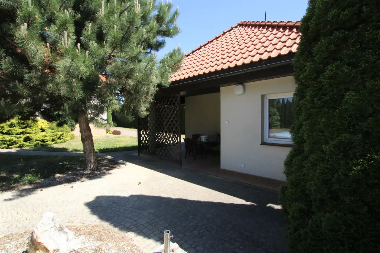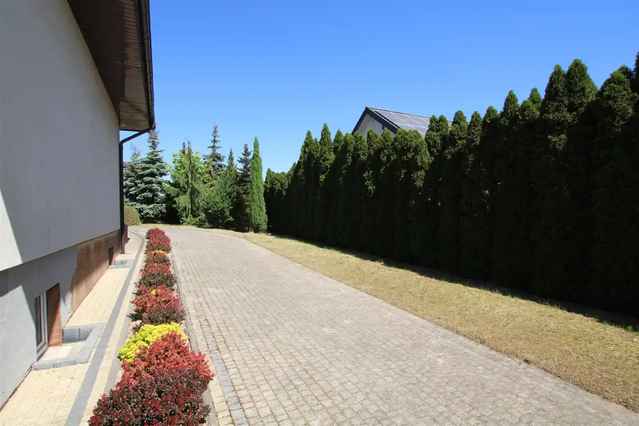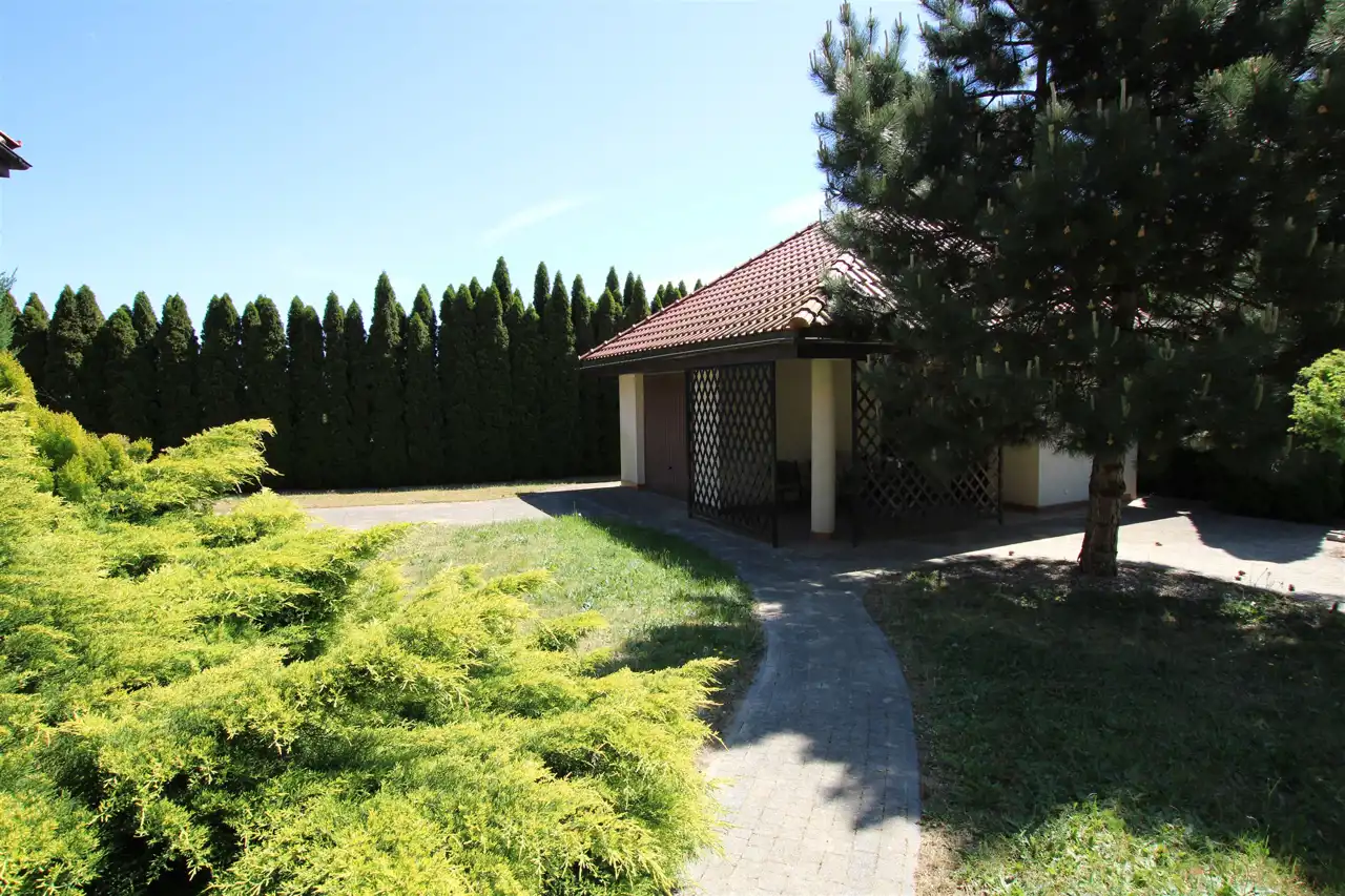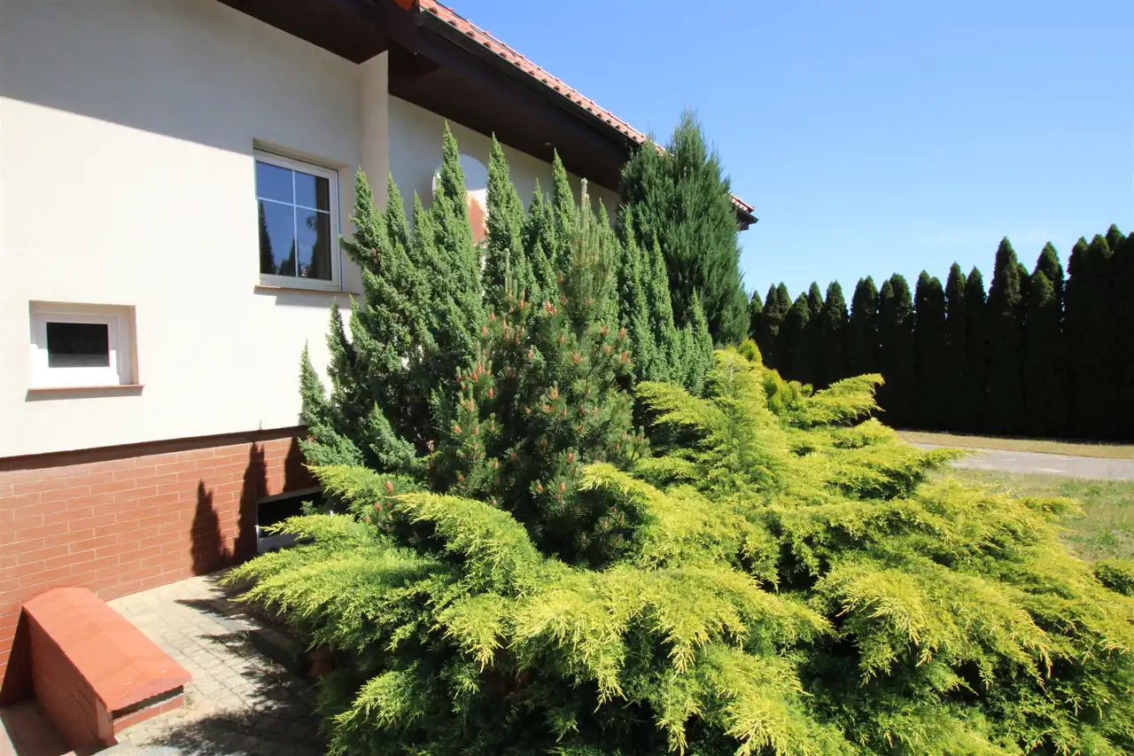 Działka pierwsza o powierzchni 1884 m2, której front stanowi wjazd została zagospodarowana kostką brukową, pozostała część to trawnik z wieloletnimi nasadzeniami krzewów ozdobnych, cała działka z wykonanym nawodnieniem oraz siatką przeciw kretom. Tył działki stanowi zaciszną część wypoczynkową z basenem o wymiarach 9m x 3m i głębokości 1,60m z wirem wodnym i pompą ciepła do ogrzewania wody. Na działce znajduje się również domek gospodarczy z garażem, letnią kuchnią i toaletą, na dachu instalacja solarna do grzania wody.