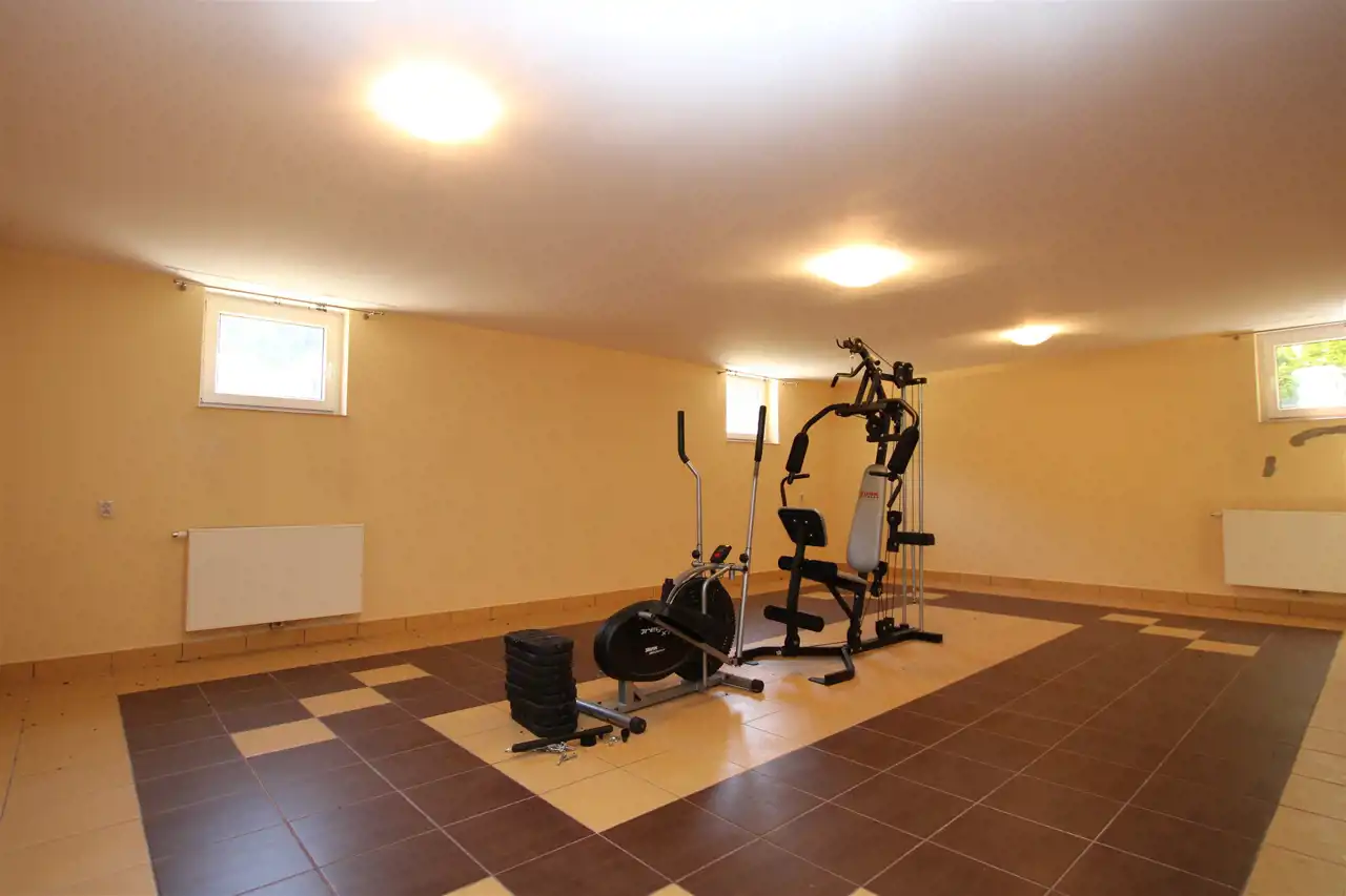 Piwnica gdzie znajduje się kotłownia z piecem na olej opałowy i zbiorniki, siłownia, pomieszczenie gospodarcze oraz prysznic, z wyjściem bezpośrednim na ogród.