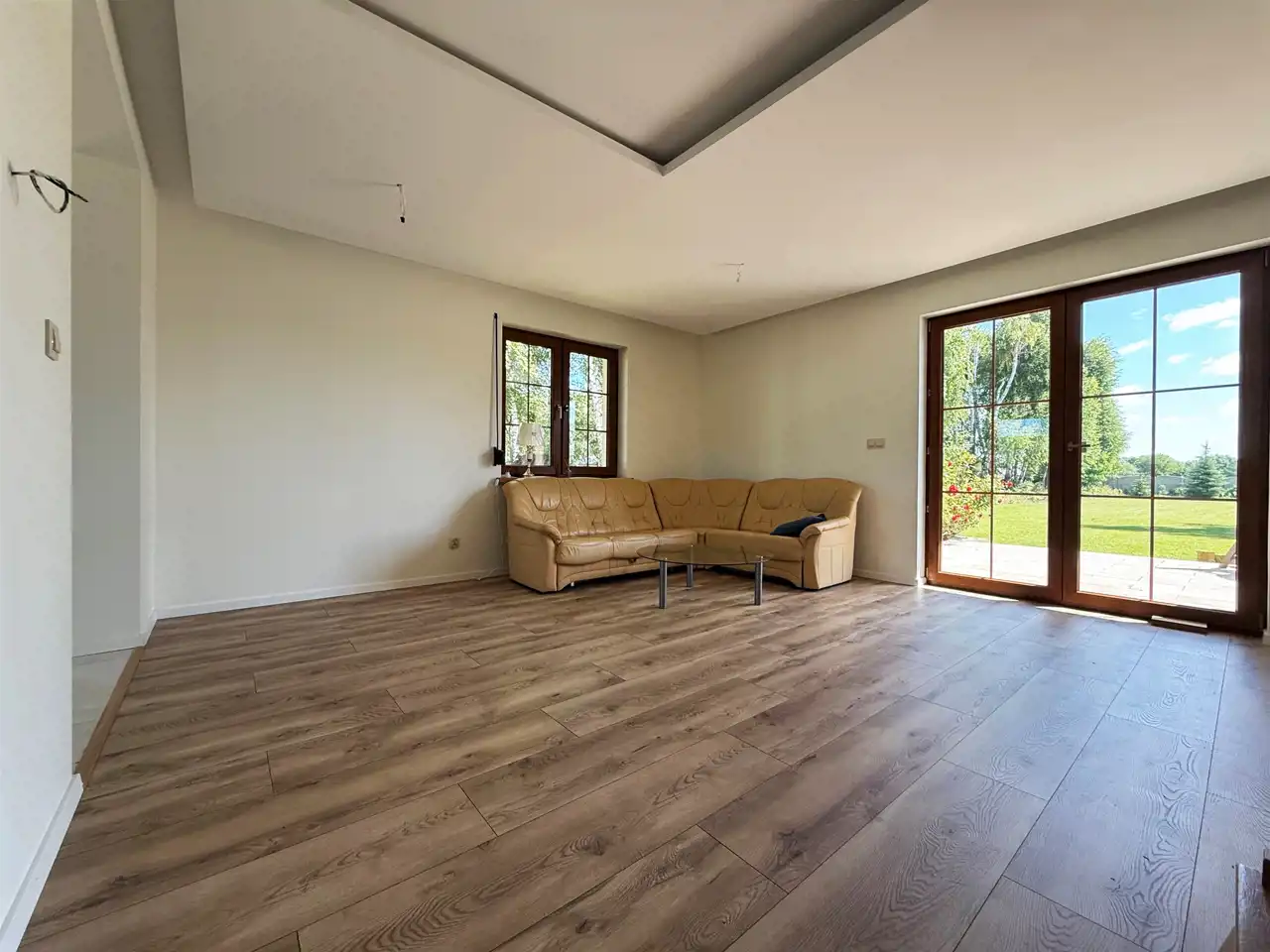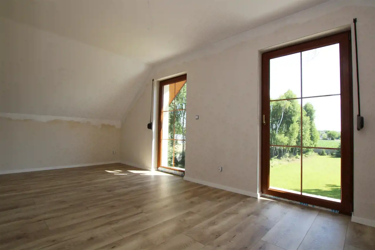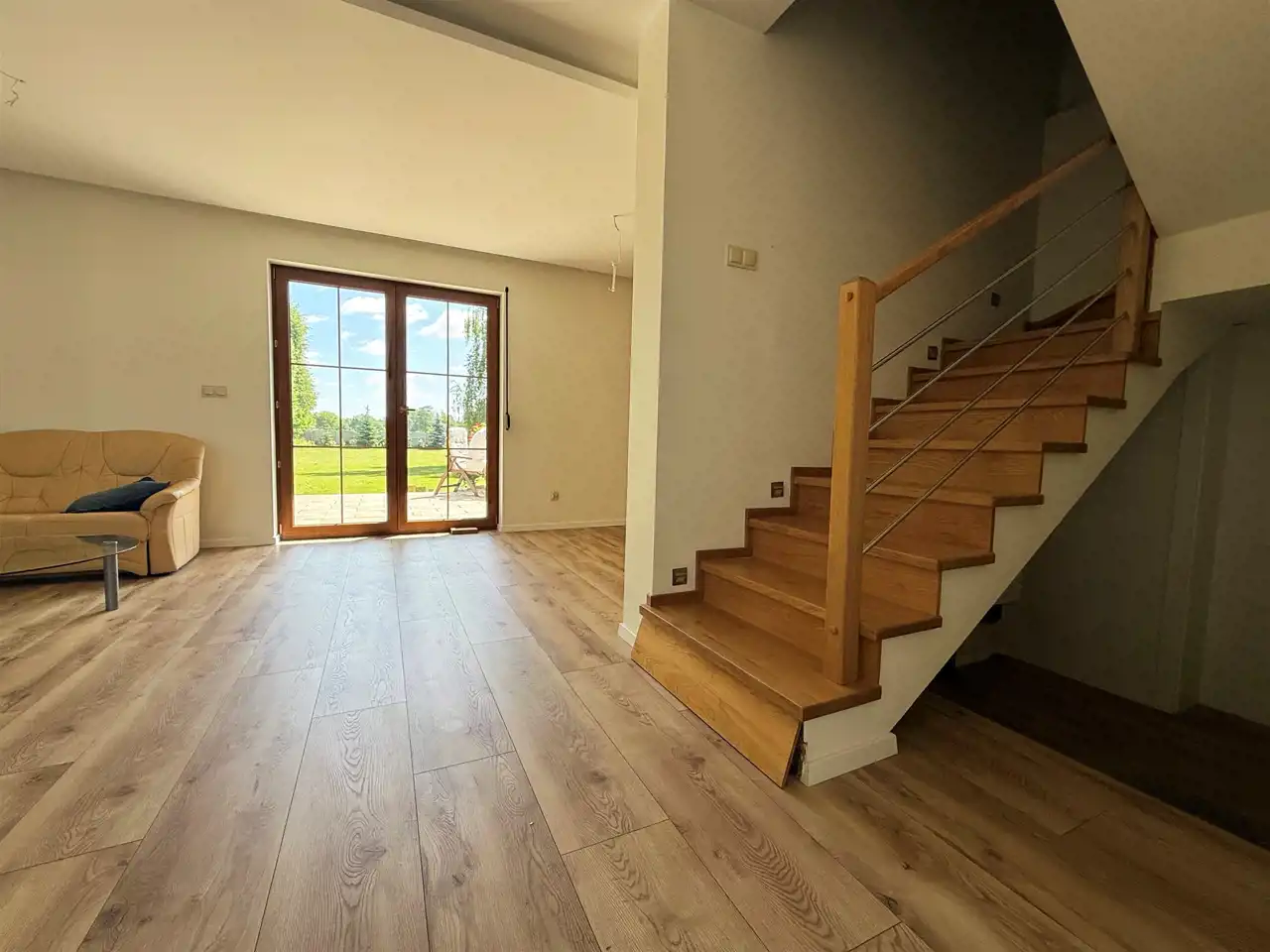 Zarówno ogród jak i budynek wewnątrz bardzo zadbane, duże okna dobrze doświetlają wnętrze, a okna tarasowe otwierają salon na ogród, powiększając tym przestrzeń.